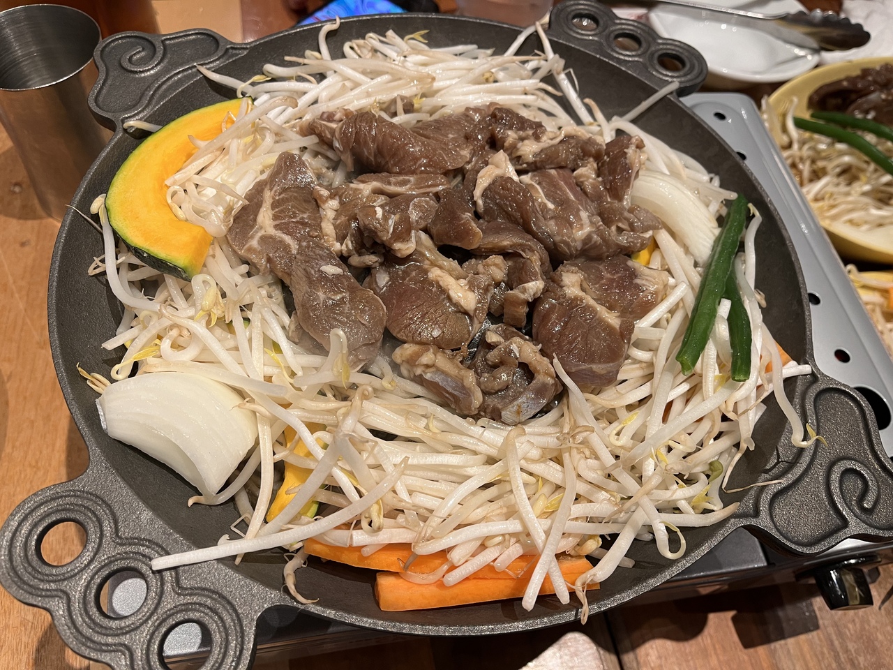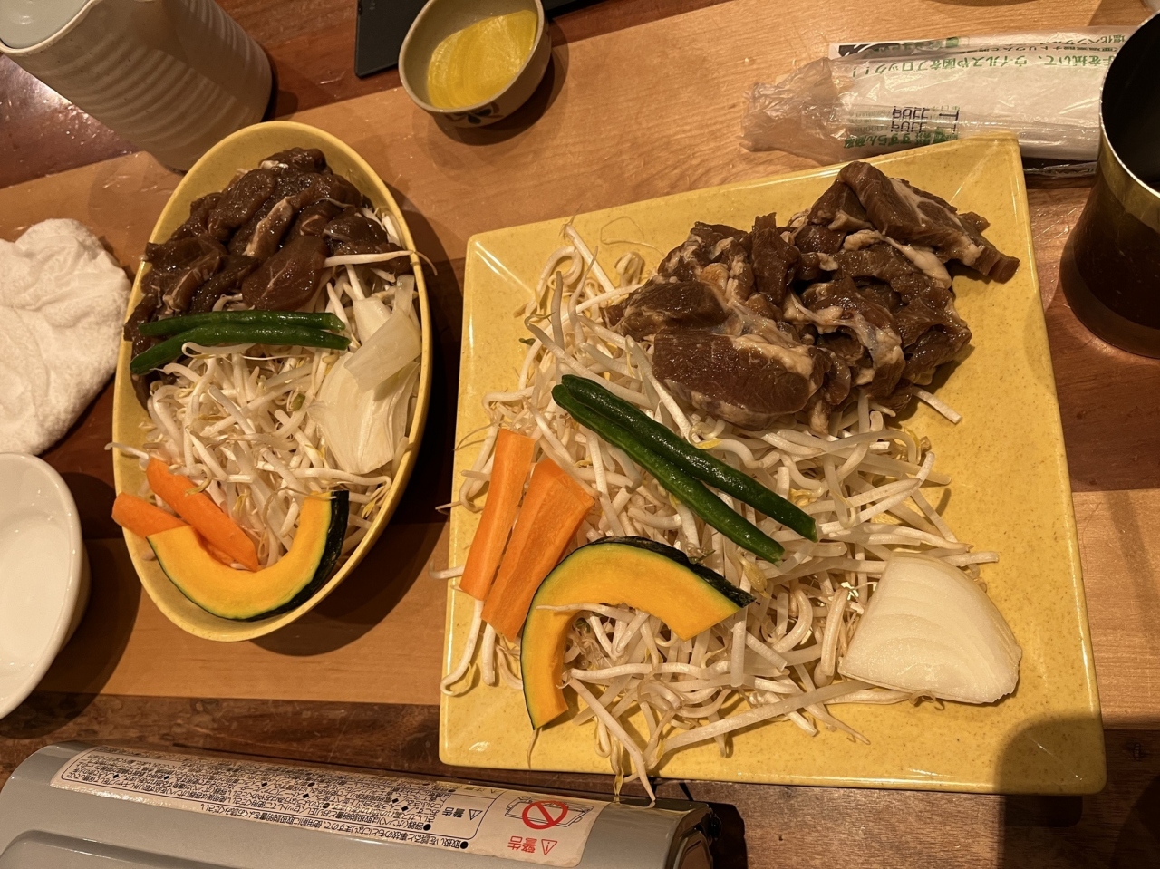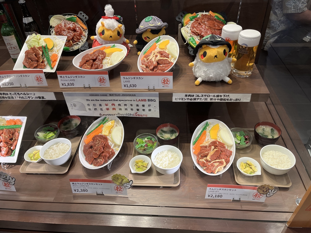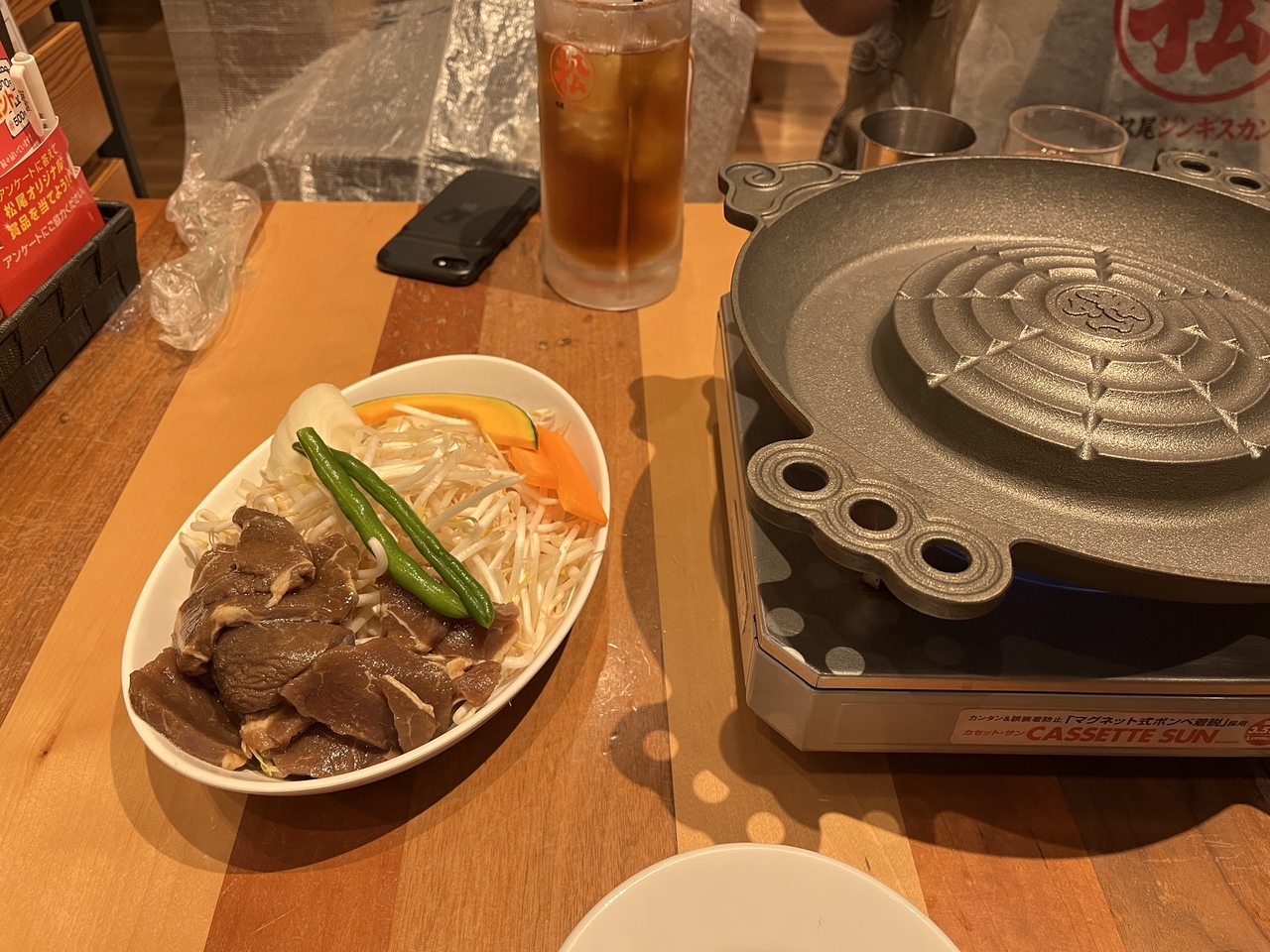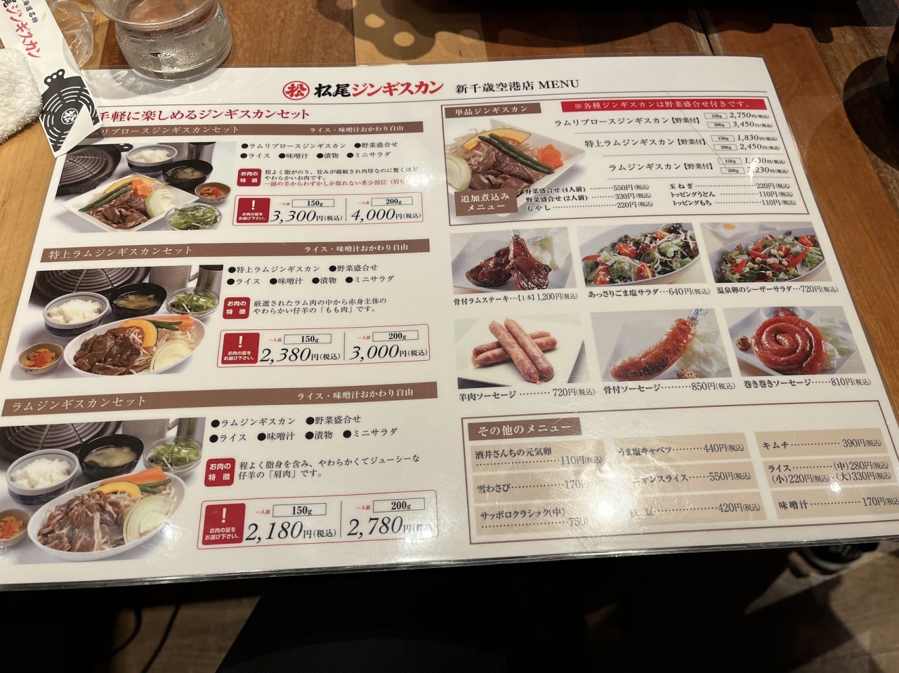 新千歳空港に着いたのが丁度昼だったので、夕食は海鮮を予約していたので、昼食は空港で松尾ジンギスカンさんにしました。空港にはフードコートと2店舗ありますが、3階の自分達で焼くお店の方に入りました。昼食時だったので2組待ちでしたが、10分ぐらいで呼ばれて中に入りました。注文はタッチパネルでした。人気ナンバー2のラムリブロースセット、人気ナンバー1特上ラムジンギスカンセットを頼みました。でも空港だからか肉はそんなに多くないので、肉の追加をしました。ご飯の追加は無料のようですが、最後のしめで頼んだうどんが味が染みとても美味しかったです。古いジンギスカン鍋を1,000円で売ってました。
