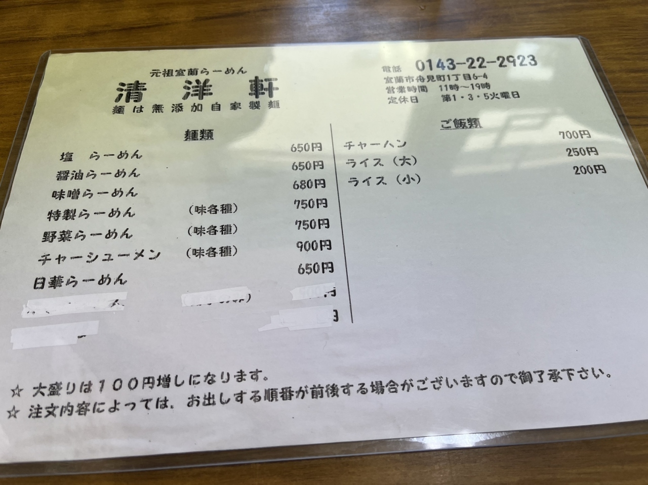 室蘭といえばカレーラーメンで味の大王さんの方が有名ですが、室蘭の街中から少し離れた所にある昔ながらの中華そばがいただける清洋軒さんで、塩ラーメン、醤油ラーメン(各650円)などをいただきました。ラーメンの他にはチャーハンとライスのみで餃子などはありませんでした。チャーシュー麺にするとチャーシューだけでなく海苔や卵、ほうれん草などが増えてます。工業の街のせいか味は全体的に少し濃いめです。場所は少し街中から離れて坂道の所にあり駐車場は2、3台停められそうでした。