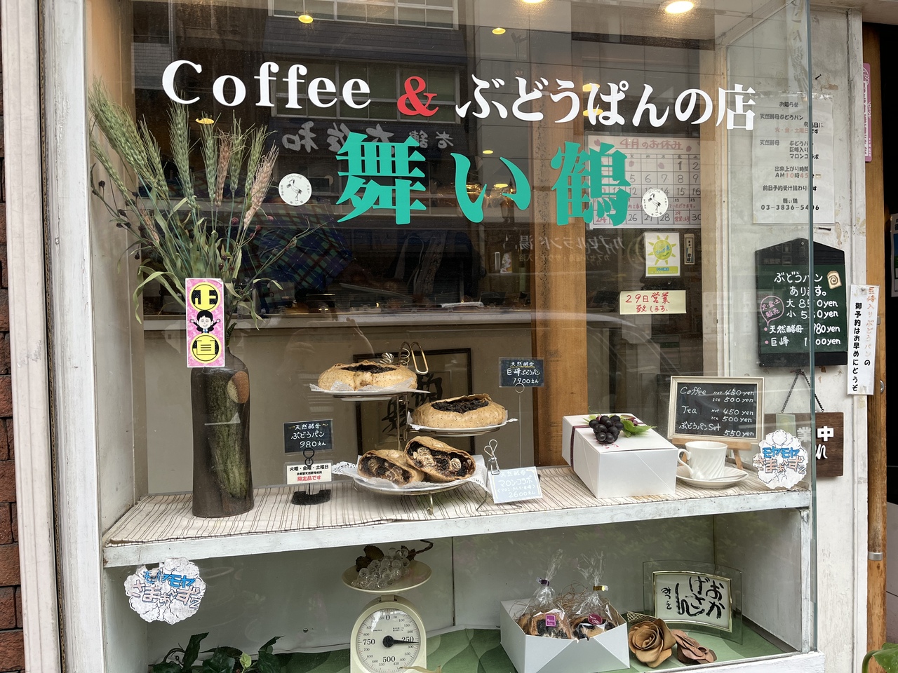 上野方面に用があったので、家族がぶどうパン好きなのでモヤさまや有吉さんぽなどのテレビにも出た事もあるという湯島にあるぶどうパンの舞い鶴さんへ行ってみました。土曜日だったので店内には限定の天然酵母のぶどうパン、巨峰パンなどの発送に店主さんは忙しそうでテーブルもパンでいっぱいで、喫茶店をやっているイメージはありませんでした。
