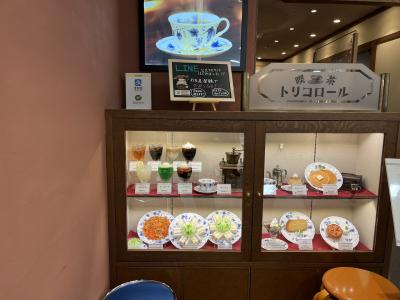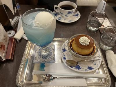 上野松坂屋さんの4階にある喫茶店です。席は狭めですが雰囲気は悪くないです。トリコロールさんはプリンの本にのったことのあるお店らしいので、お腹いっぱいでしたが私は土日祝日限定の空色クリームソーダとプリンセットと夫は普通にブレンドのコーヒーを頼みました。