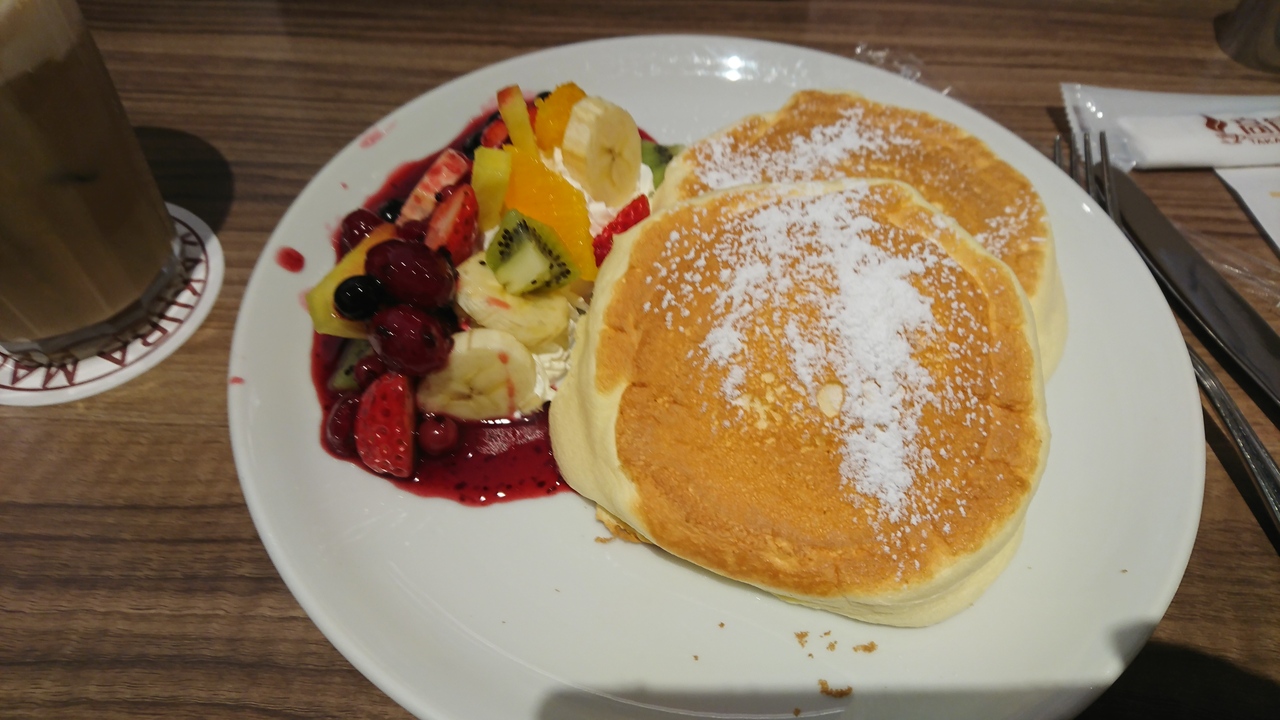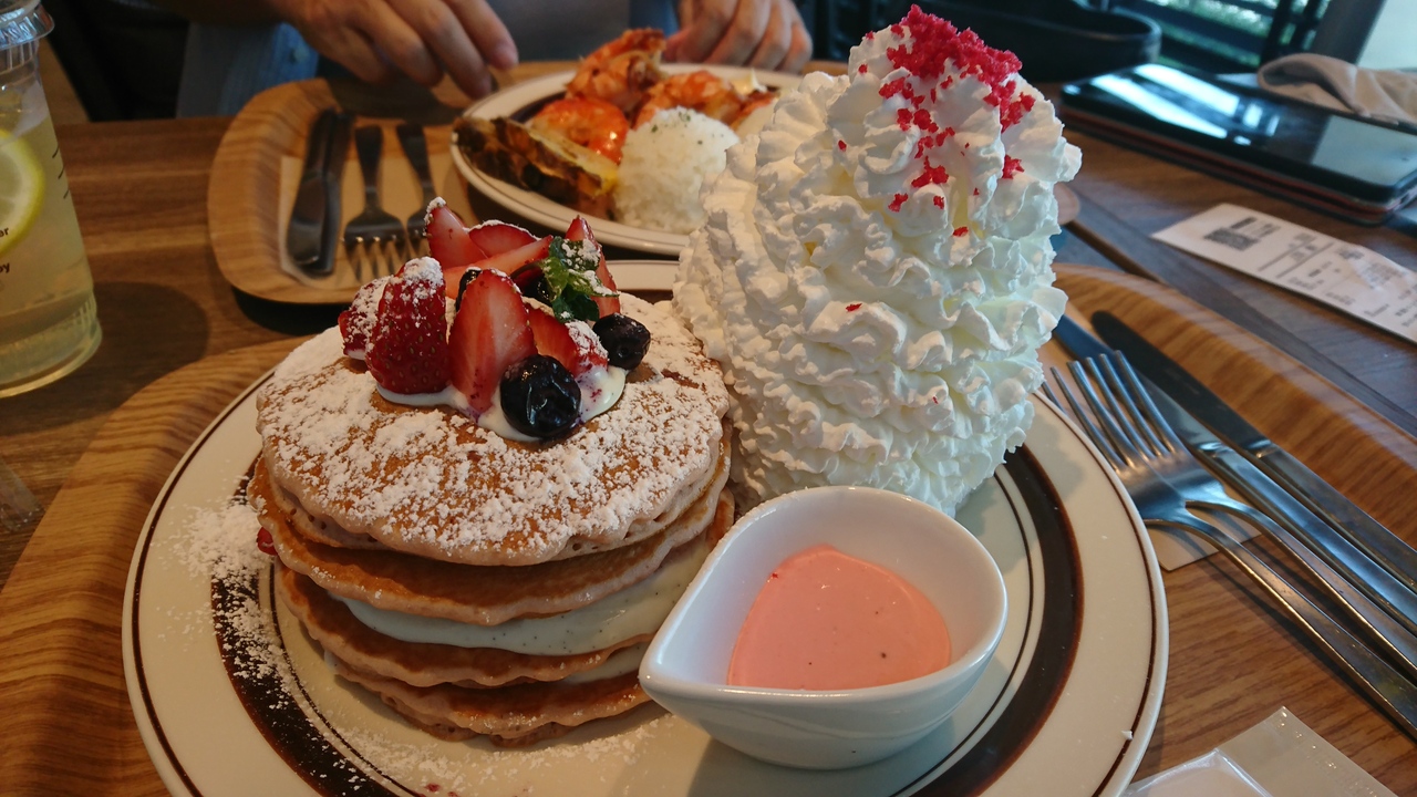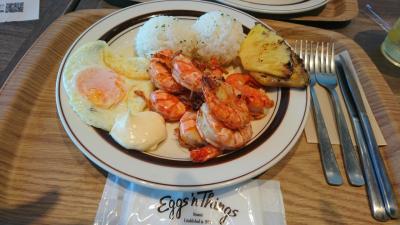 出来て2年ぐらいは経っていると思いますが、土日の昼どきはいつも並んでるイメージのエッグスンに平日に行ったので並ばず空いている席もあったので入りました。パンケーキは季節のいちごのパンケーキにしました。おいしかったですが、メニュー写真の様なピンク色でなく味的にはOKですが少し焼きすぎか?残念ながらピンク色ではなかったです。クリームは本場より軽い感じですが山盛りでハワイ気分を盛り上げてます。夫の頼んだガーリックシュリンプはおいしかったです。二人で飲み物まで頼むとお高めなので並んでまではいいかな、でもこのままコロナでハワイが恋しくなったら平日狙いで行っちゃうかも。