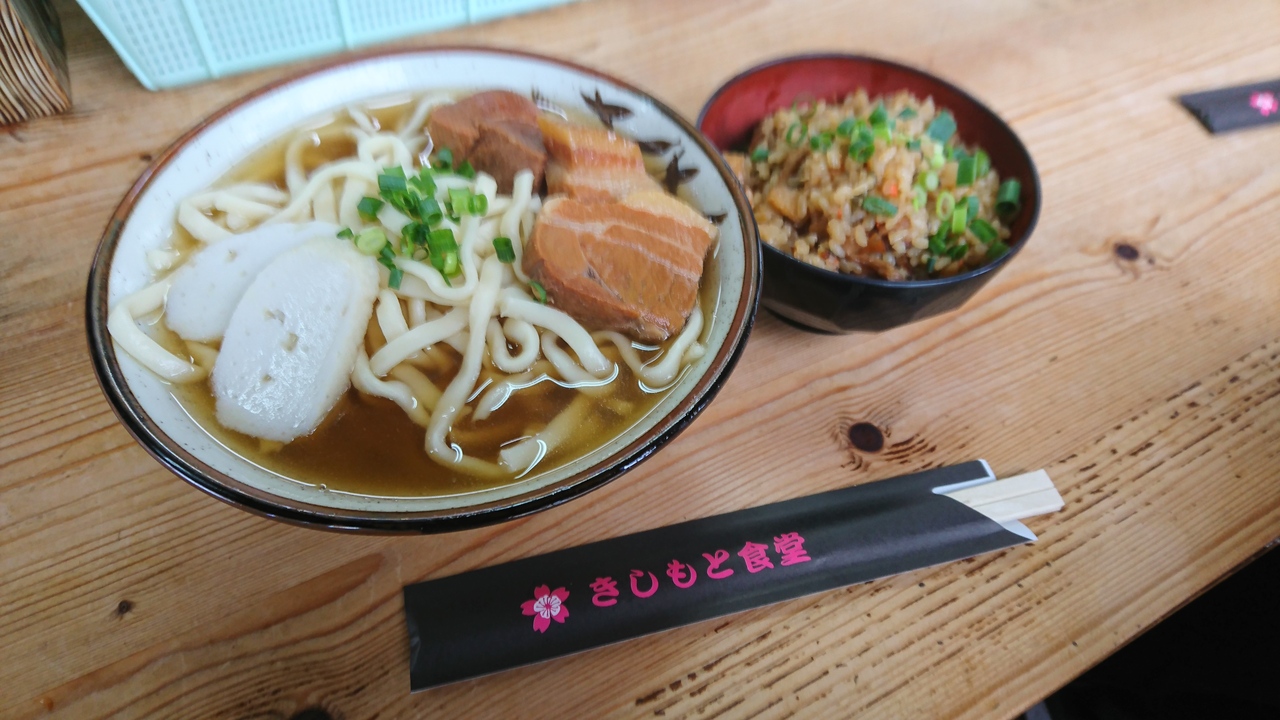 お昼時がずれて少し遅めの昼ごはんになってしまったので、あまり混んでいませんでしたした。車で行くので駐車場がいっぱいある街中にある本店ではなくこちらの八重岳店に行きました。食券を自販機で買うシシテムでメニューはジューシーと岸本そばのサイズ違いのみです。麺が太くて私のイメージの沖縄そばというよりはうどんよりの沖縄そばでした。ジューシーは少し濃いめの味付けでした。