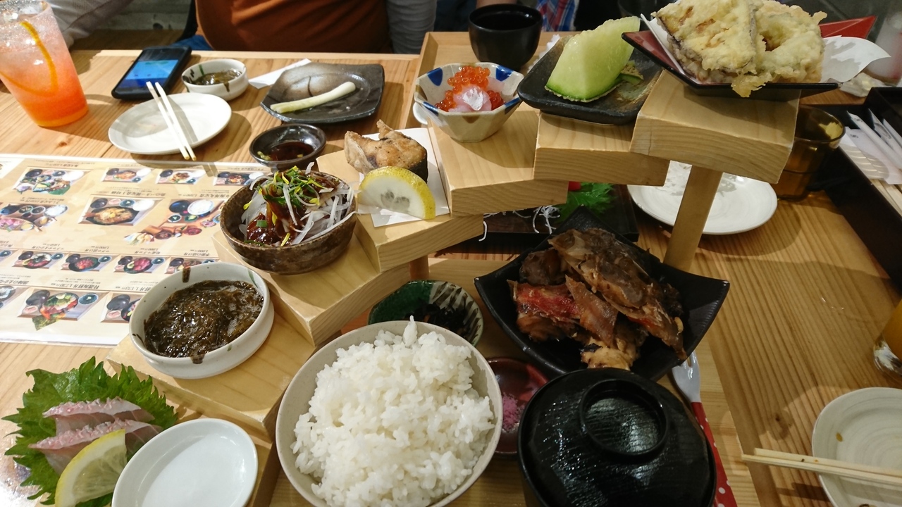 夕ご飯に行きました。車ならショッピングセンター的にハナサキマルシェの中なので駐車場の心配ありません。夕方行くと私達で満席になるくらい混んでいました。グルクンの唐揚げ、もずくの天ぷらなどの酒のつまみ系は量は少なめでしたが、日替わり定食はすごくボリュームがありました。他にもっと良いお店もあるのでしょうが、コロナのご時世関東からの観光客でも入るやすいイメージのお店です。