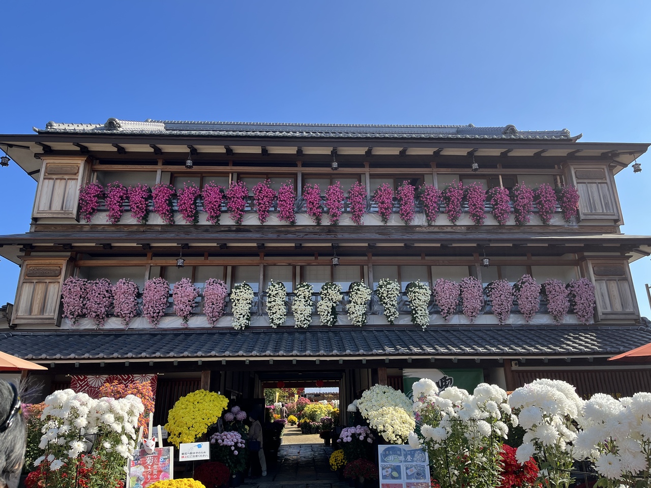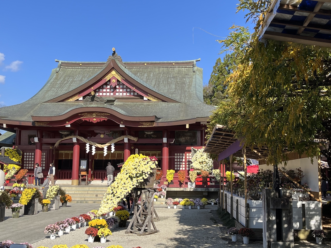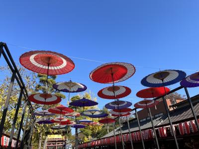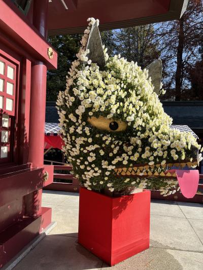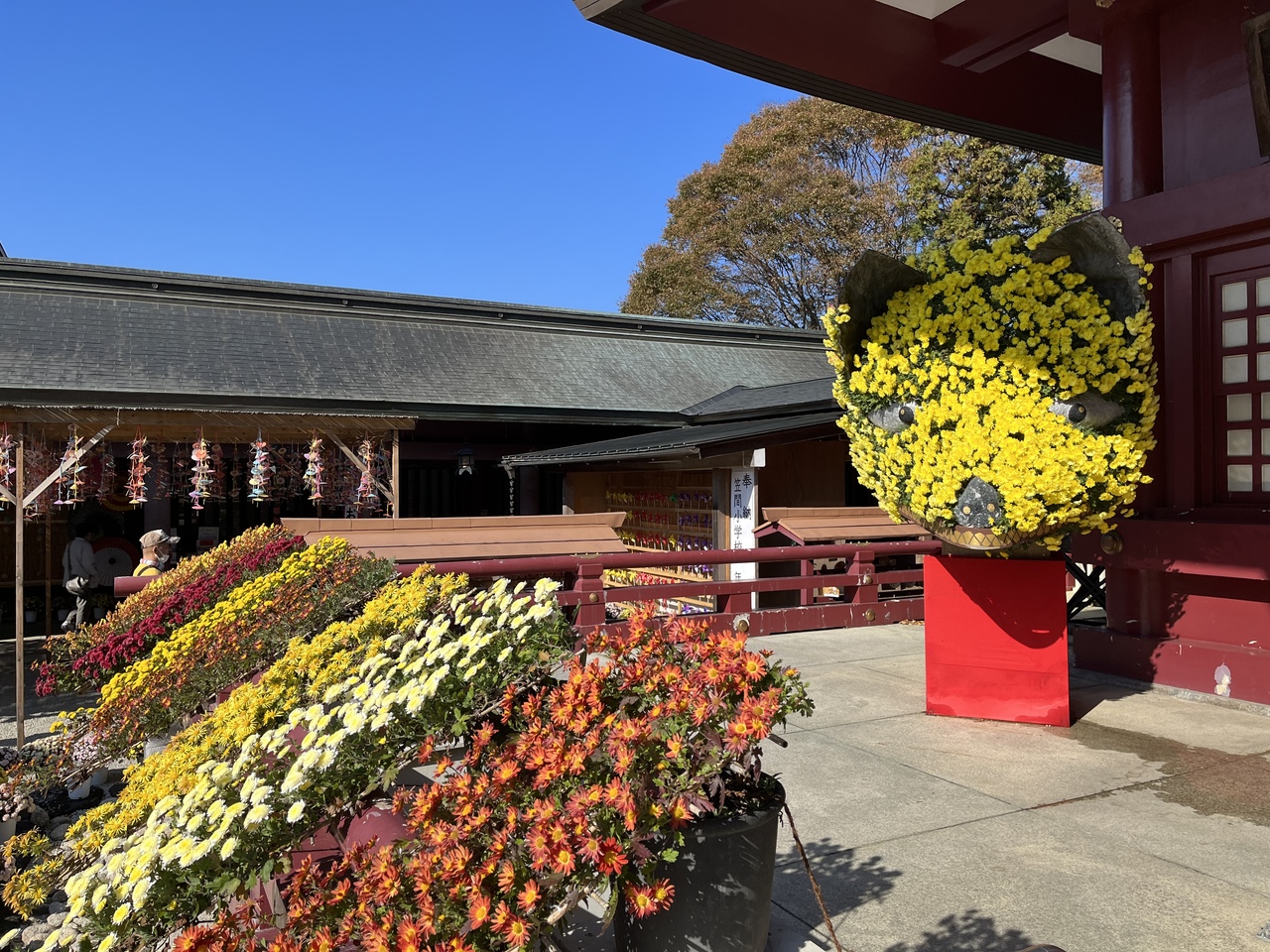 菊まつり期間に初めて笠間稲荷に行きましたが、今まで行った神社の菊まつりは端の方で立派な菊が鉢に入れられたり、菊人形が飾られているイメージでしたが。参道が菊一色という感じで、菊でできたキツネが本殿にまで置かれていました。日本三代稲荷のひとつなので正月や何もない時には来た事があったのですが、和傘などもレイアウトされ映えそうな神社でした。稲荷神社なので、名物の稲荷寿司を買い、胡桃稲荷などが名物なのは知っていましたが胡桃の御神木があるのは今まで気づかなかったです。
