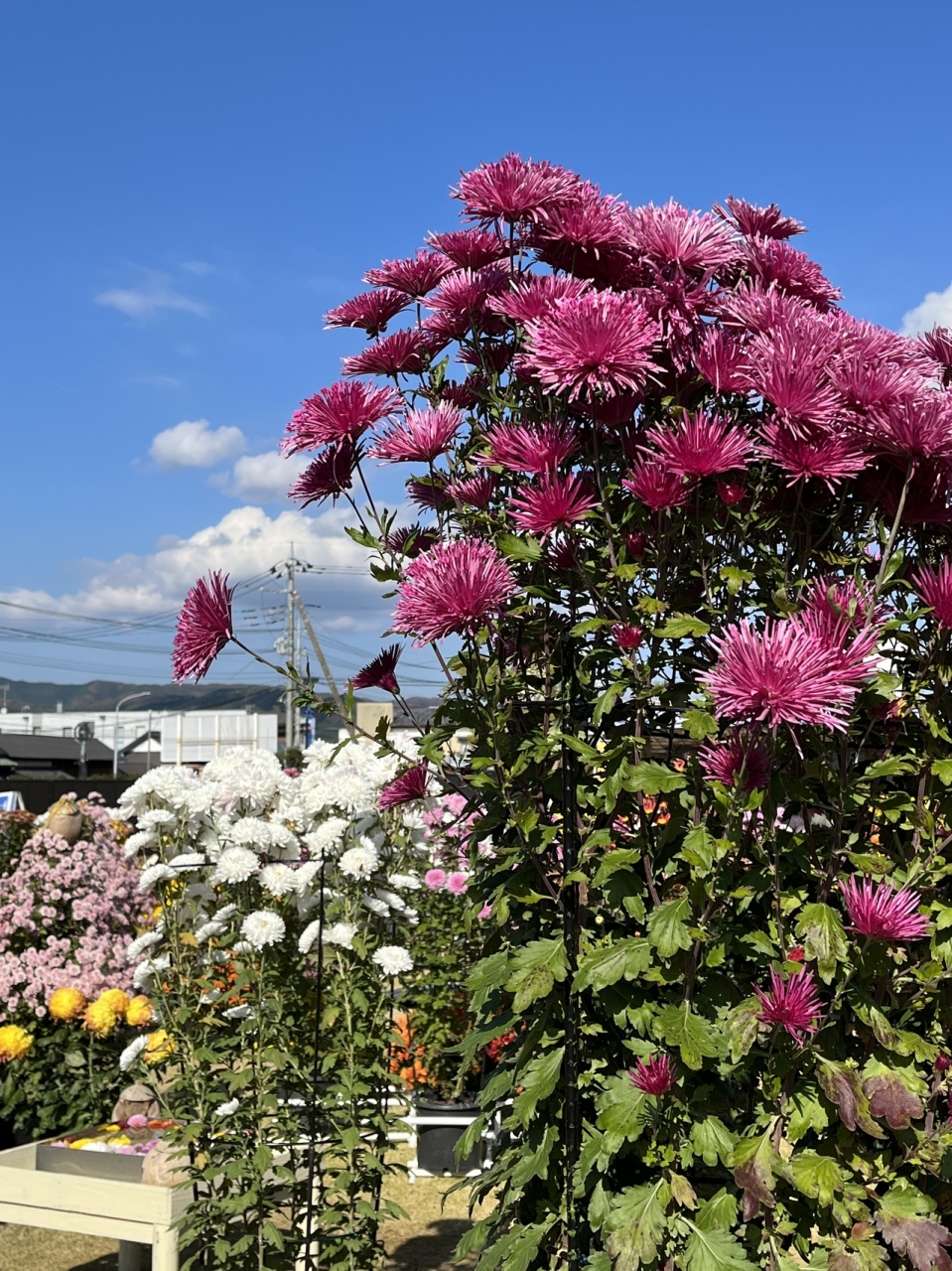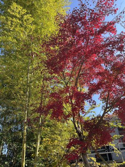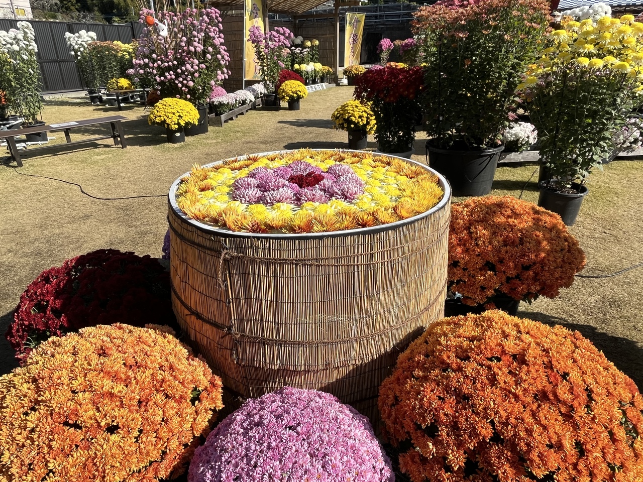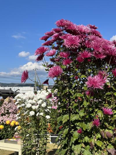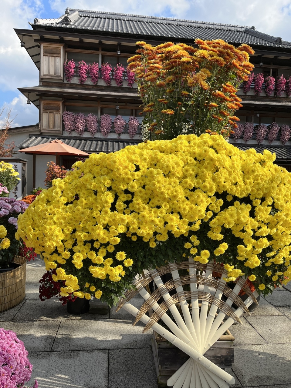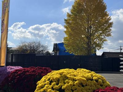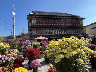 2022年は11月23日まで開催の笠間の菊まつりの会場のひとつで、東日本大震災まで旅館をやられていた建物がリノベーションされ観光案内所的になっているところです。喫茶店もありました。菊まつりとしては建物にまで飾られた菊が印象的でした。石切山脈などで有名な稲田石で敷き詰められた広場に菊が飾られていました。端の方には少し紅葉したもみじもありました。