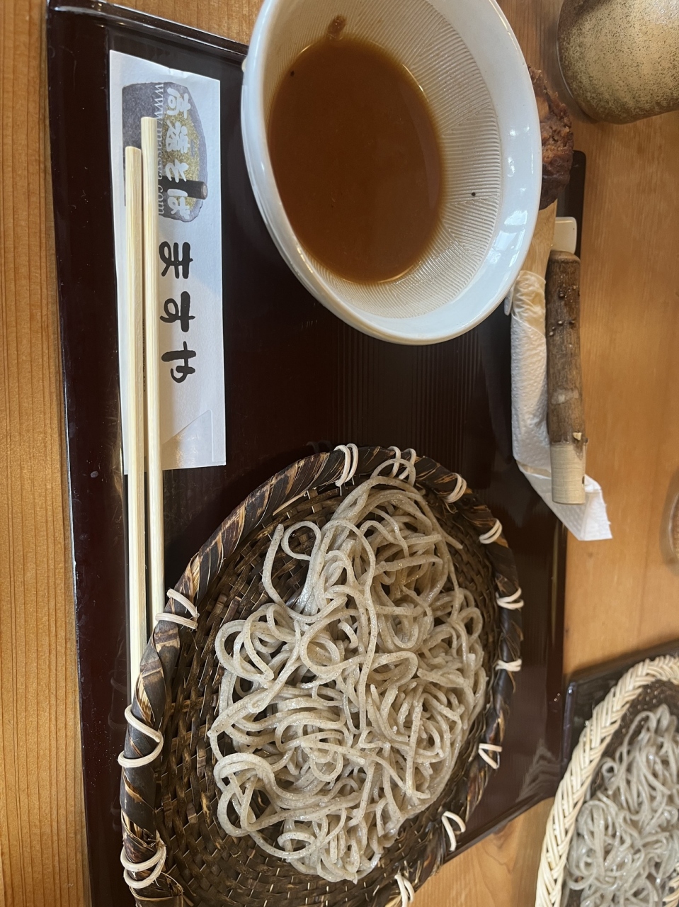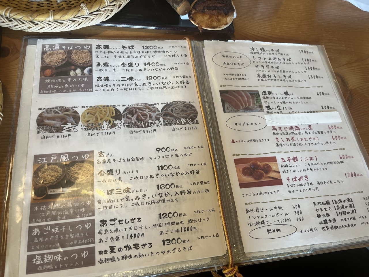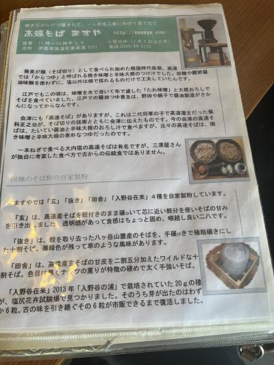 高遠にある高遠そばの有名店のひとつです。月曜日の12時半前に訪問したのですが、県外ナンバーの車で駐車場はいっぱいで、30分以上待ちました。私達はギリギリ4種の蕎麦を全て選ぶ事ができたのですが、私達の2組後からは3種類になり帰る頃には1種類になり、営業時刻より早く蕎麦はなくなってしまいました。色々な種類を食べたい方は早い時間の訪問をおすすめします。とても美味しいお蕎麦でしたが、新蕎麦ではなかったので少し香りが弱目な気もしました。