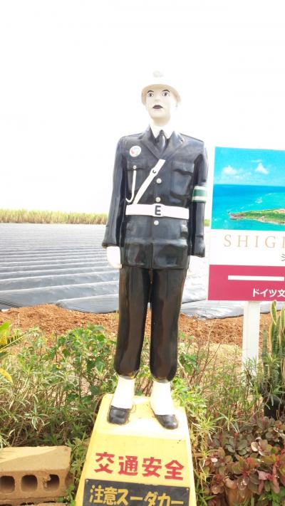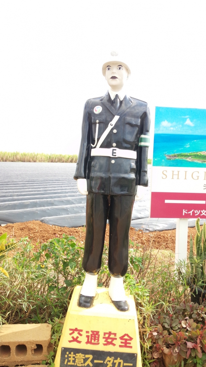 宮古島をレンタカーでドライブしていると何度か見かける、警察官の服装の交通安全を呼びかけてたっている宮古まもるくんです。宮古島に何人(何体)もいて、正確には色々な名前もついてまもるくんだけではないようです。