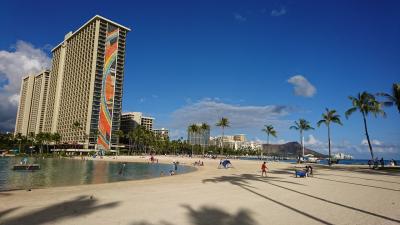 ヒルトンラグーンの前のビーチでヒルトンの宿泊客などで人はそれなりに多いですががワイキキのビーチよりは空いています。全米 ビーチランキングにも何度も入っているほど綺麗なビーチなのでヒルトンレインボータワーと海を一緒に写真に撮るととってもいい雰囲気です。夕暮れ時にはもっと素敵です。