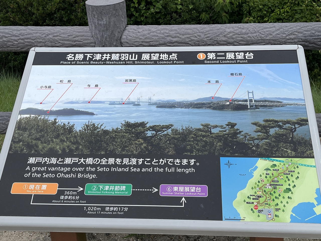 天気が曇っていたので少し瀬戸大橋の景色と海の色が残念でしたが、天気が良ければさぞ絶景という感じでした。ルカリオのポケふたがあるので行きましたが駐車場からは結構階段があり行くのは大変です。すぐ近くにに障がい者の方用の駐車場がありましたので足の悪い方などはそちらを利用した方がいいと思います。