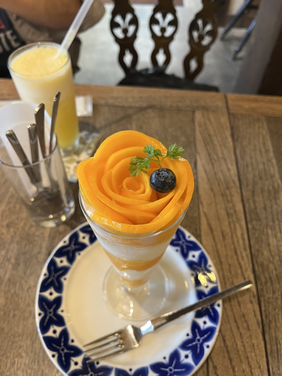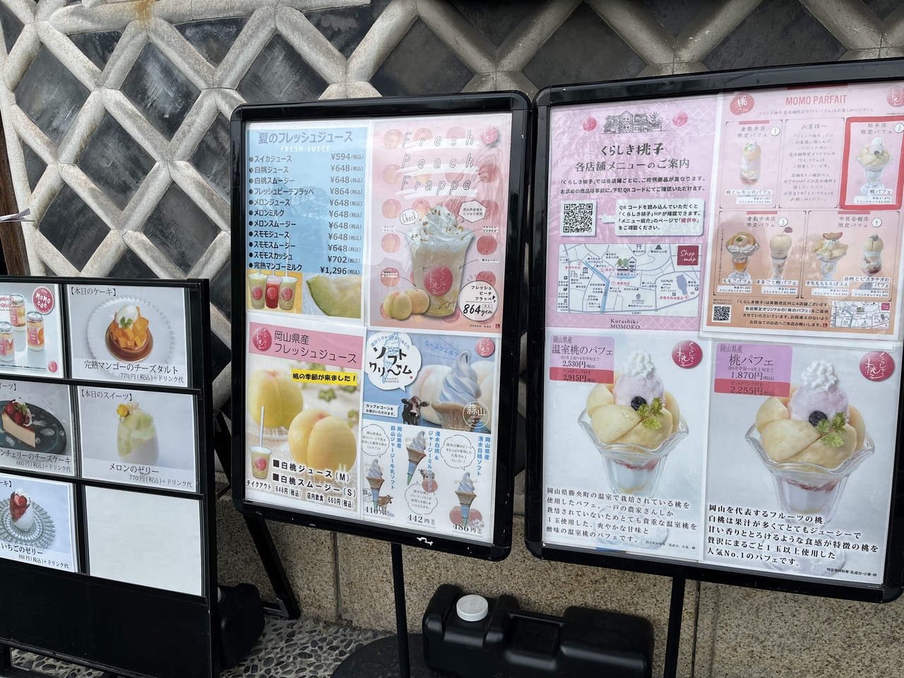 倉敷に行ったら行ってみたかったお店のひとつでした。天気も悪い平日だったので行列という事はなく、ただレジで注文してから座るのですがそれに時間がかかり少し待つ感じでした。席に着くとゆっくりでき、フルーツパフェはコンフレークなどでかさまししてはいないのでお値段は納得でした。マンゴーパフェ、その他のジュースは美味しいかったです。桃も美味しいかったですが、上に乗っている物はシーズン初めなので、他の方も前の方が甘かったと言っていたし私もちょっとそう思ったので少し甘くなるのかなと思ったので、ベストシーズンに今度は是非行きたいお店です。
