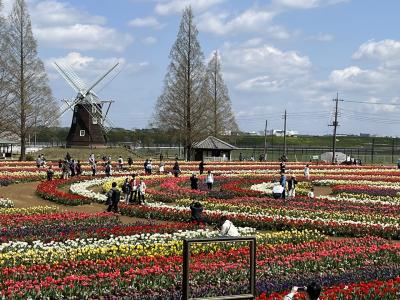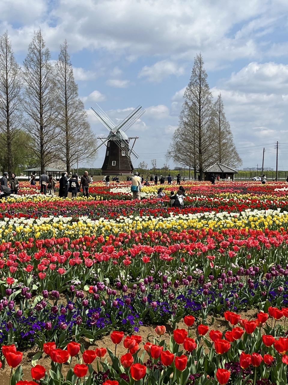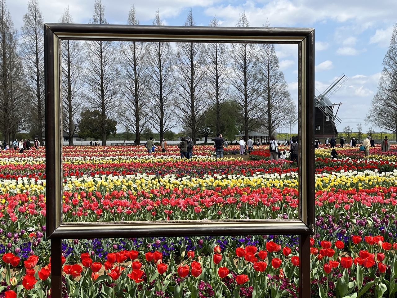入場料、駐車料金無料でこの数のチューリップが見れるなんてとても素晴らしいです。ただシーズン真っ盛りの土日は道路も混むので交通規制や駐車場に泊めるのも大変そうです。元から水車もありますし、額縁や緑色のドア、台で上から撮れるようになっていたりして映えそうな写真が撮れそうですが、さすがに人はたくさんいます。桜の山もありましたが、残念ながら4月に入っていたので桜は終わりかけていましたが桜の季節だったのでお店も出ていました。あけぼの山公園はひまわりやコスモスなども綺麗な様です。