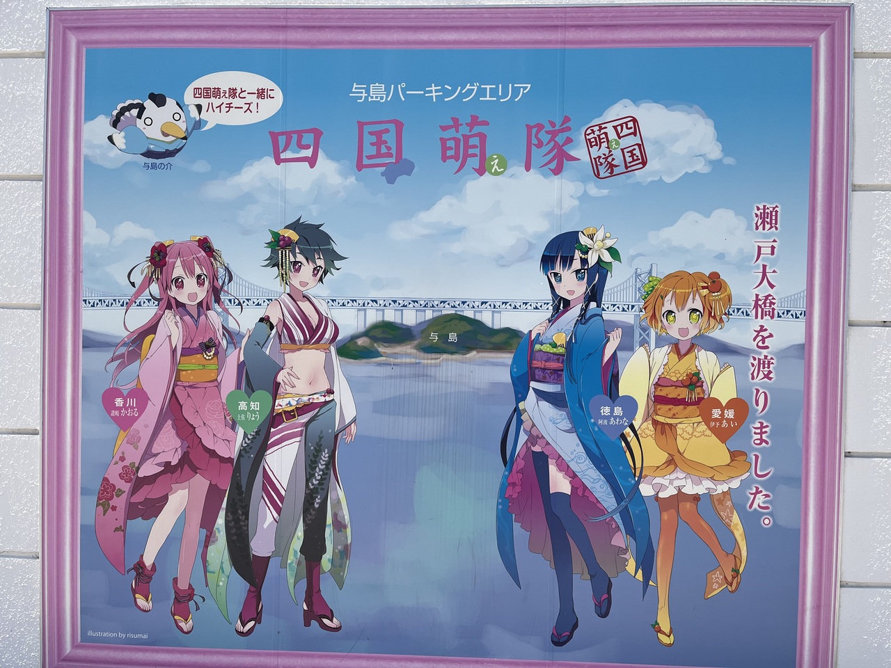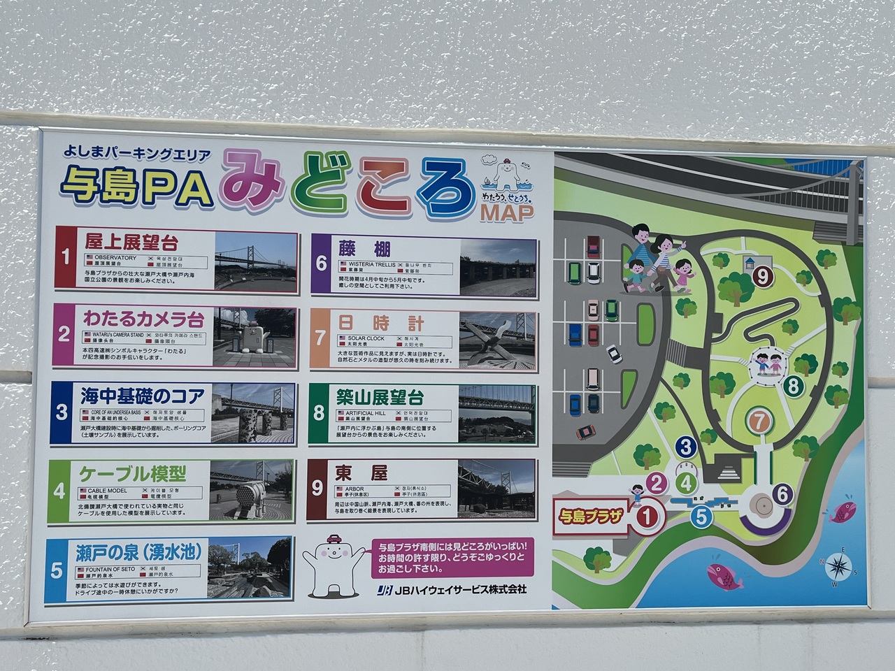 瀬戸大橋の中間地点にあるパーキングエリアです。瀬戸大橋も綺麗に見えて、瀬戸大橋の事も勉強でき広いパーキングエリアなので時間があればでなく時間をつくってでも寄ってもらいたいパーキングエリアです。アクアラインの海ほたると同じで絶対一度は寄ってみたいパーキングエリアです。