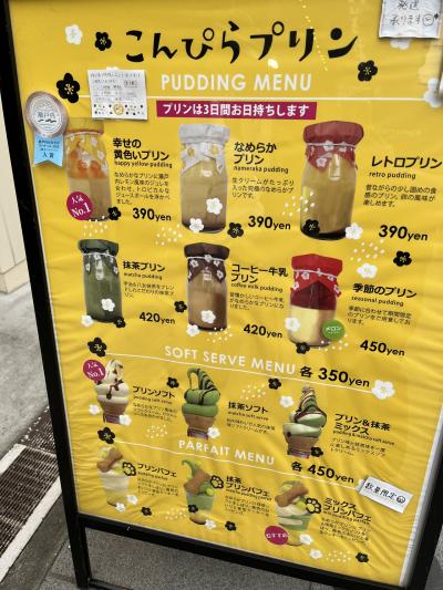 こんぴらの参道にあり泊まった敷島館、日本酒を買いに行った金陵さんの前にあったので、購入しました。幸せの黄色いプリンが一番人気のようなんですが、個人的には好みではありませんが。カラメルのないタイプで黄色いプチプチした小さな球体にゆずのジュレ的な物が入っているのですが、プリンと一体化していない様な気がすしました。他のプリンの方がいいかも。