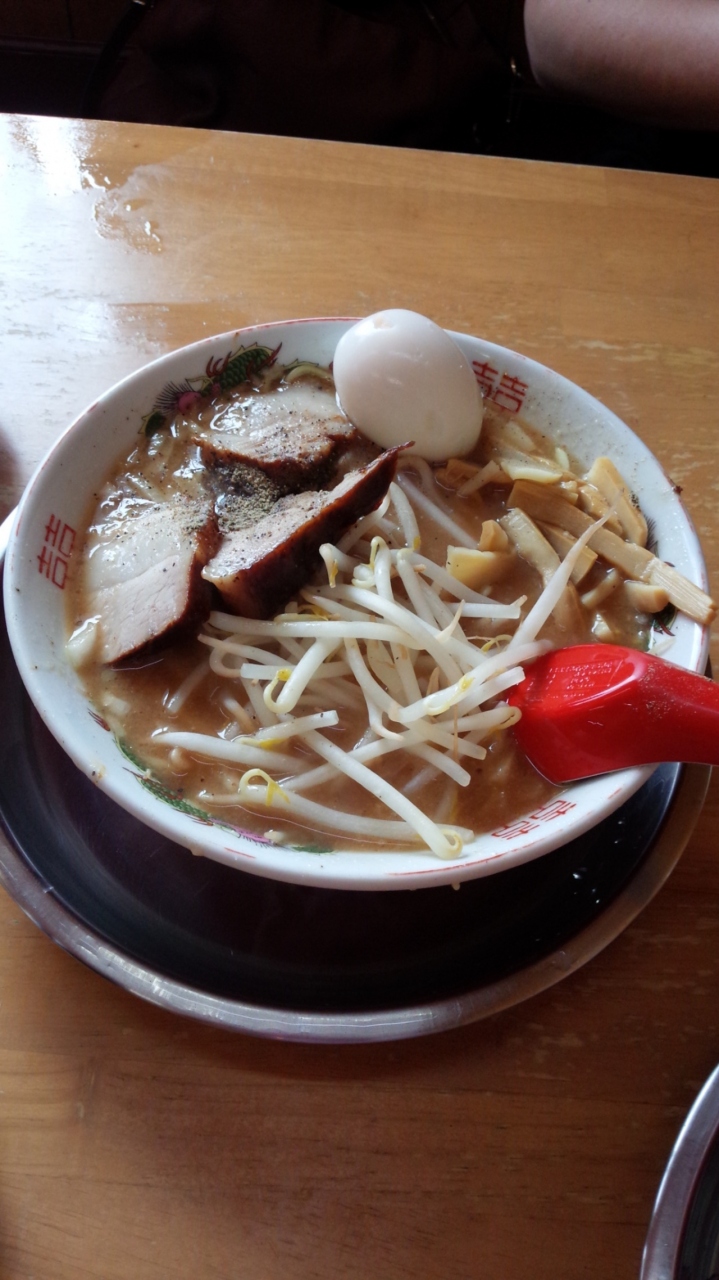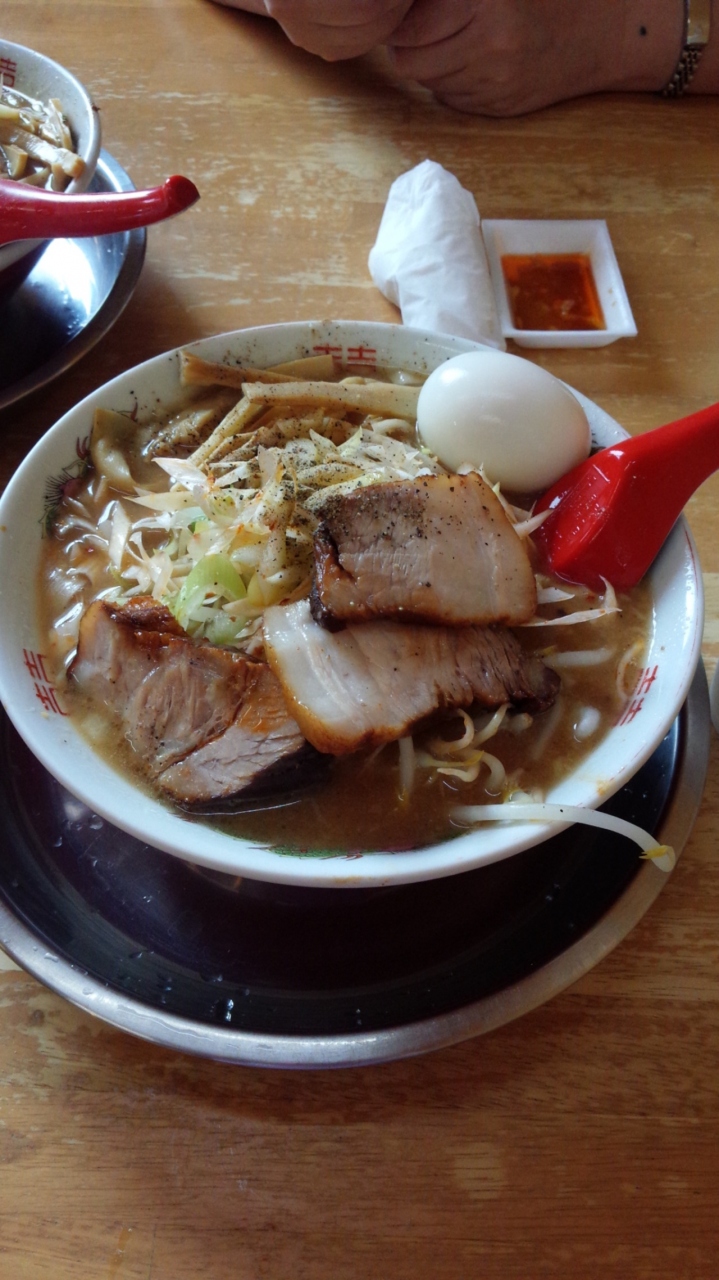 とんしおラーメンが名物のようですが豚骨ラーメンではなく結構濃いめの味つけで私には濃い過ぎでした。ネギラーメンにしないとネギは入っていなく玉ねぎが入っていて、柔らかくて美味しいチャーシューが3切れ乗っていました。ラーメンを頼むとゆで卵が無料なので、入り口のゆで卵を取ってラーメンが来るまでに剥いて準備しておくといいです。餃子は肉汁たっぷりで美味しかったです。- 旅行時期