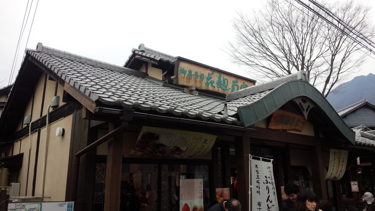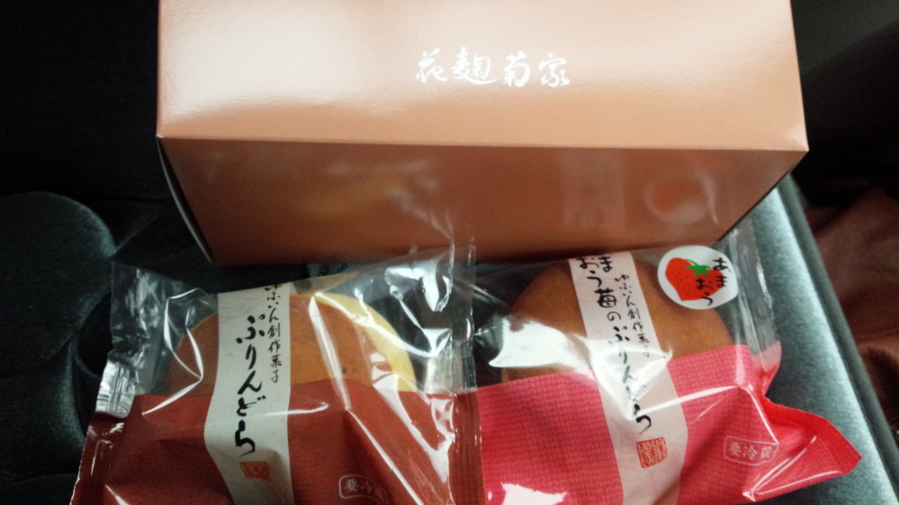 湯布院でお土産を買おうと思い、花麹菊屋さんでに有名なプリンどらと季節限定のあまおうイチゴのプリンどらを購入しました。
