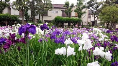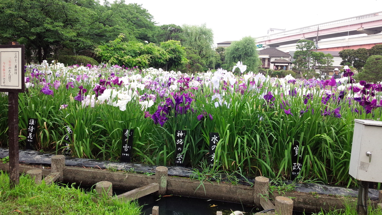 首都高速道路とビルがある中にあり、堀切菖蒲園駅からの歩いて10分ぐらいですが近くまで来ると、綺麗に紫陽花も咲いていて道路にも色々な種類の菖蒲の絵が埋め込まれていて駅から楽しんで歩けました。