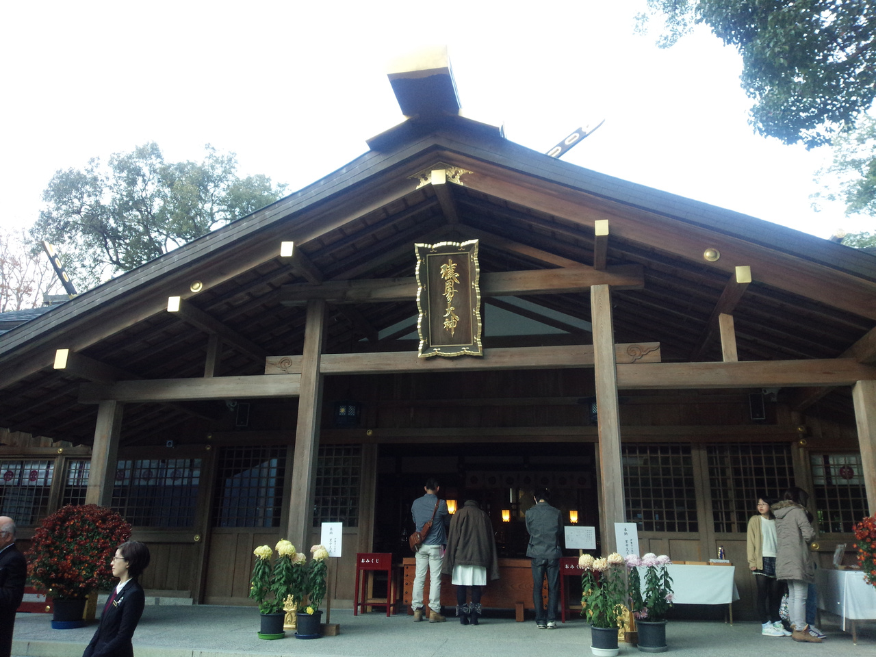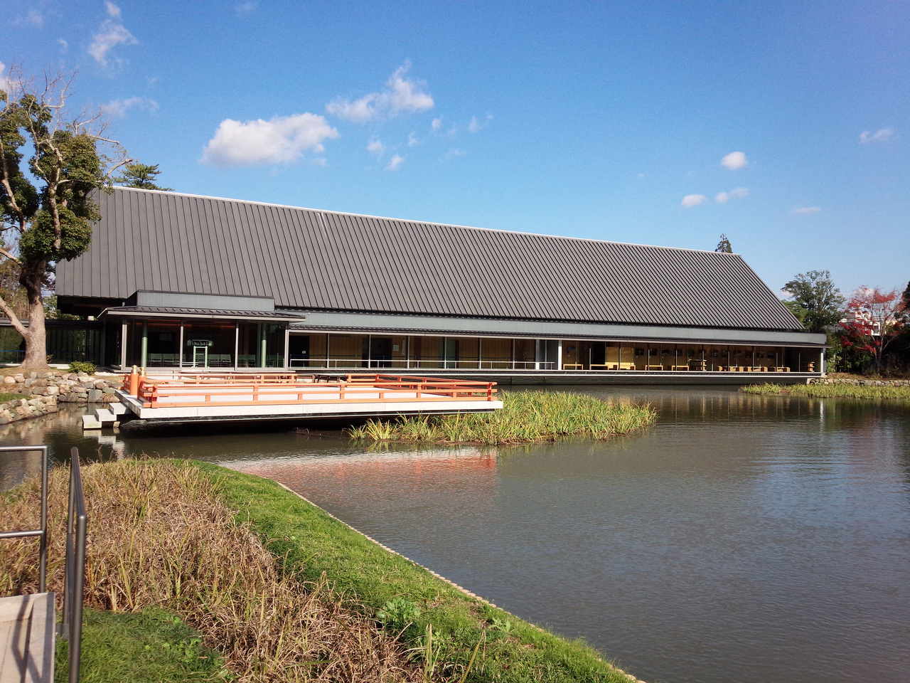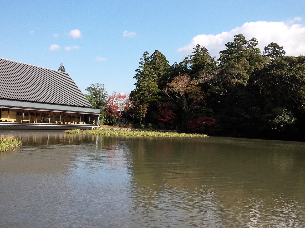 前回はせんぐう館に入館し中から勾玉池を見ましたが、今回はせんぐう館には入らず池の周りを少し歩いてみました。奥の方の木が少し紅葉していたりして、池に浮かぶ能舞台とのコントラストがとても美しくいい雰囲気でした。池の周りには無料の休憩所もあるのがいいです。