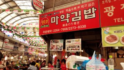 広蔵市場にレバ刺しとユッケを食べに行った後に少しご飯物を食べたいと思って、市場内の色々な店で細巻きのキンパが売っていたので食べてみました。