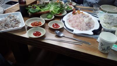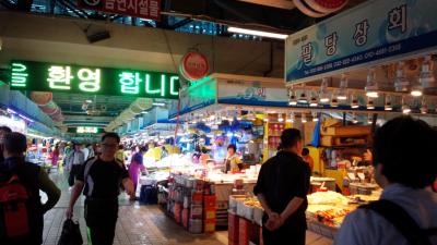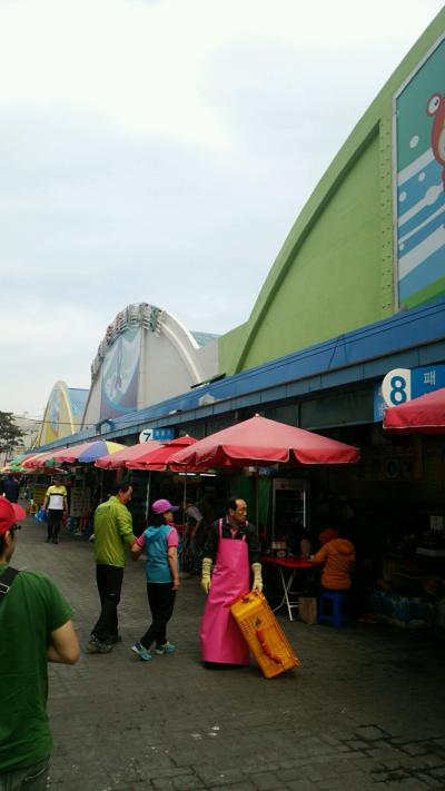 大きな魚市場で魚屋さんがいっぱいあり、魚屋で好きな魚を買って提携の店で食べれるシステムになっていましたが、日本語はほぼ通じません。魚の加工食品を売っているゾーンもありおみあげも買えます。ソウル市内で刺身を食べるよりだいぶ安いと思います。