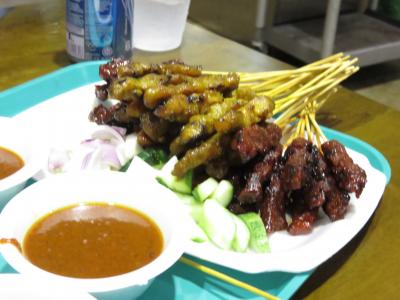 午後9時頃行ってみましたが、少し時間帯が遅かったのか、オフィス街なので土日は休みなのか、中の店は閉まっているところも多く食べたいものは、品切れ中などが多かったので、外のサテー屋台でサテーをたくさん買って夕食代わりにしたので意外とコスパは良くなかったですが、サテーの味は美味しかったです。建物の中にいてもサテー売りのおじさんが回って来ます。