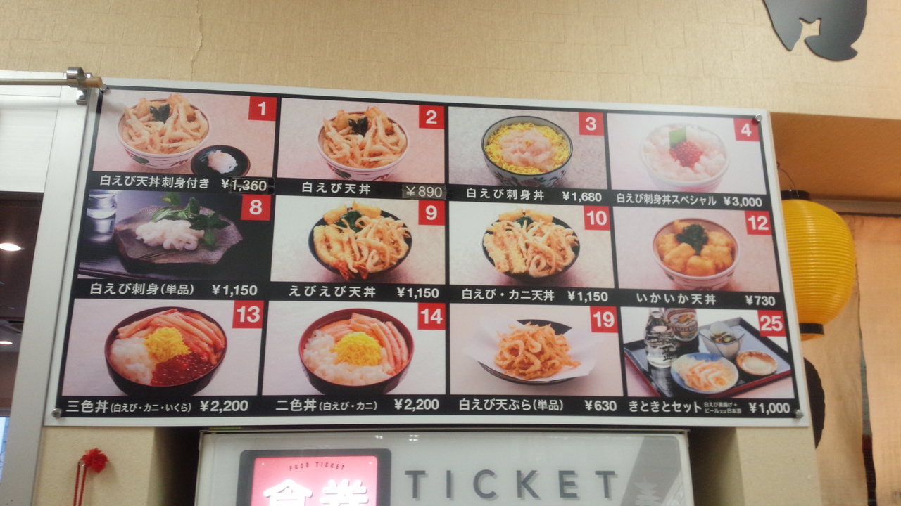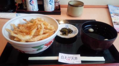 白エビ天丼JTBでクーポンがついていたので行ってみました。富山駅新幹線の工事のためか仮設の店舗のようですし、お茶などもセルフで食券を買う方式なので雰囲気はオススメというわけではありませんが、白海老天丼(890円)カラッと揚がり、天つゆ薄味で美味しかったので、もし白エビのシーズンに来ることがあれば生の白エビも食べてみたいです