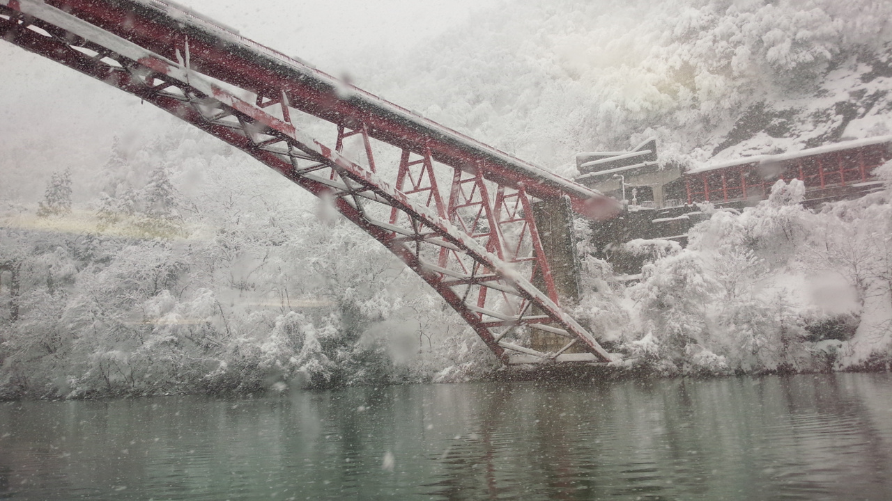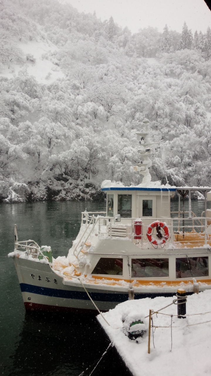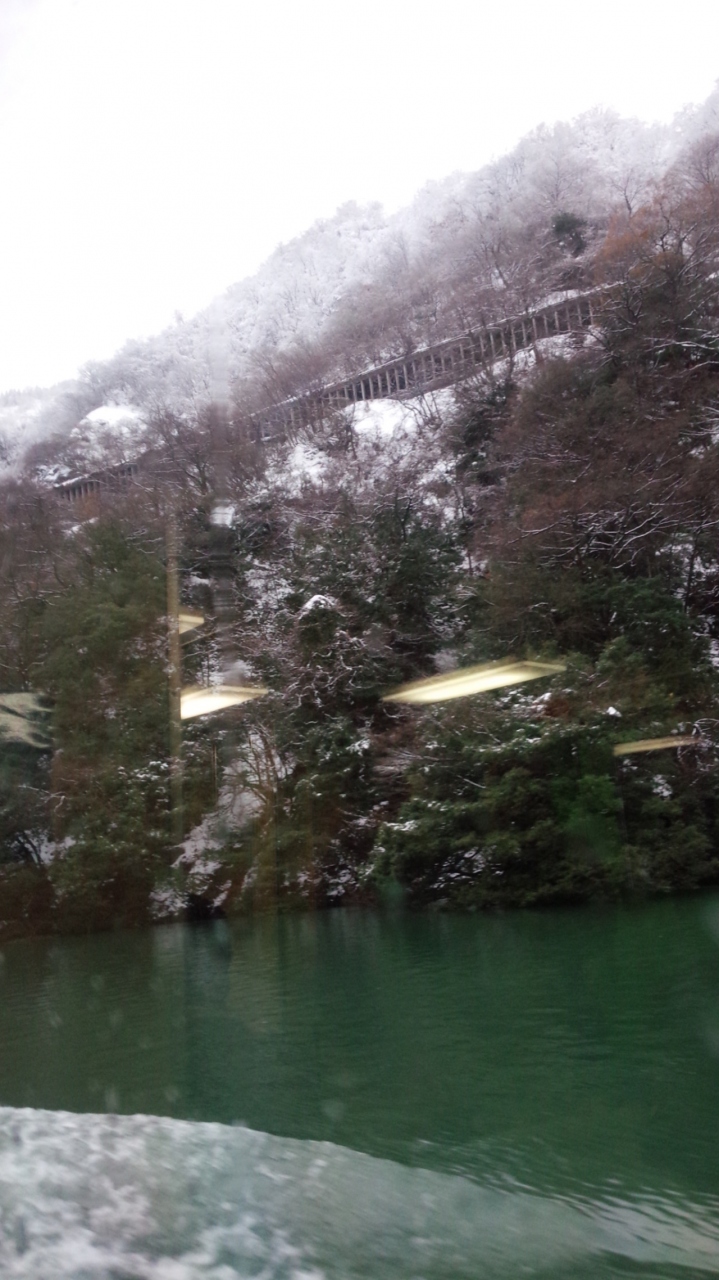 大牧温泉旅館に泊まる時に遊覧船に片道30分も乗るので、遊覧船から荘川峡の景色がたっぷり楽しめます。ただ冬は寒いので船の中からなので反射して写真はうまく撮れませんでした。雪の降りしきる中我慢して外で撮ればもっといい写真が撮れると思いますが、行きは木の緑に雪が少しついた感じで、帰りは完璧な真っ白な雪景色と2つの景色が楽しめてとても良かったです。
