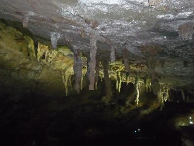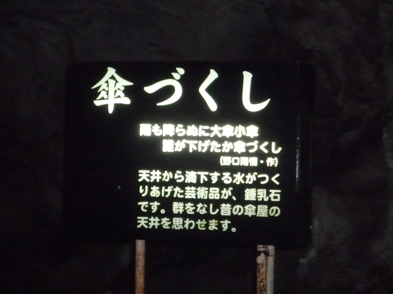 秋芳洞の見どころのひとつですが、黄金柱、百枚皿に比べるとすこしたいしたことはないかなという感じでした。垂れ下がるっている鍾乳石を傘にみたてているのですが、傘というよりは鍾乳石のつららといった方があっている気がしました。