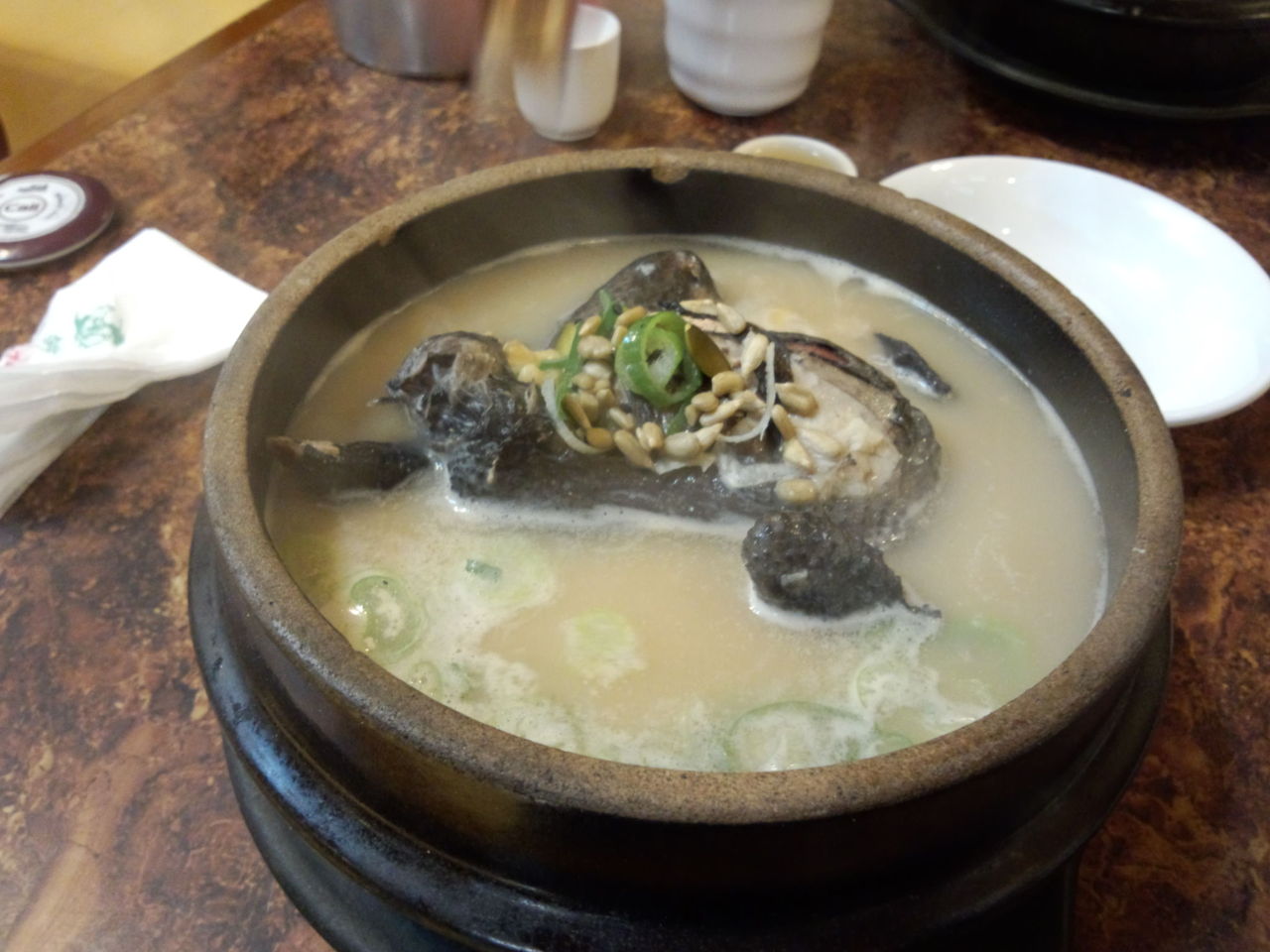 前に待ったことがあるので、開店直後にいったので待たないで入れて、普通の参鶏湯と烏骨鶏の参鶏湯をたべました。