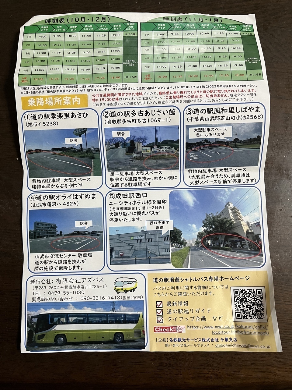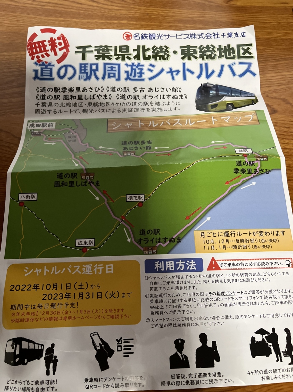 道の駅3個をめぐるミニトリップで行きました。実証実験中で令和5年1月末まで無料であさひ、多古、芝山、蓮沼の道の駅と成田駅を結ぶ無料バスが1日六便運行中でした。アンケートに答える必要はあるようですが、面白い企画です。蓮沼の道の駅は海産物が豊富で、胡麻鯖やお鍋に入れようかと思いミニはまぐりの冷凍を買いました。海水ネギが大人気で米袋にいっぱい入った根がついたネギが2袋私がいる間にも売れ、ビニールに入った海水ネギを買っていらっしゃる方も何組かいたので大人気のようです。2014年の台風被害で塩害のネギが美味しくなったのをもとに工夫をされたミネラル豊富で甘いネギのようです。祝日だったのでタイ料理のお店なども出ていました。どんな理由かはわかりませんが、道の駅に入る時は買い物しなくてもカゴを持って入るようにと入り口に表示がありました