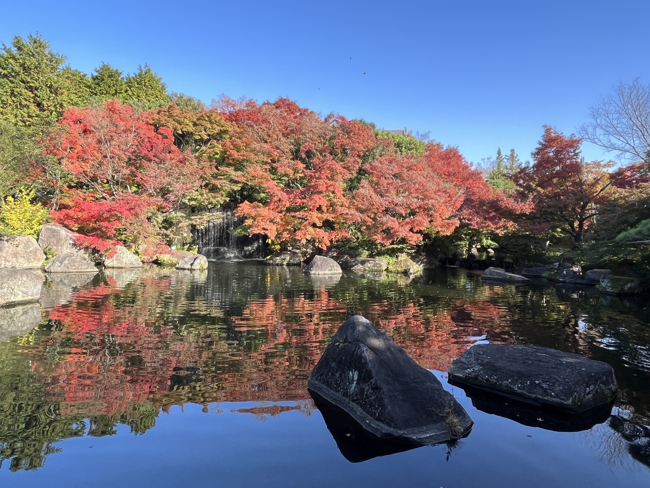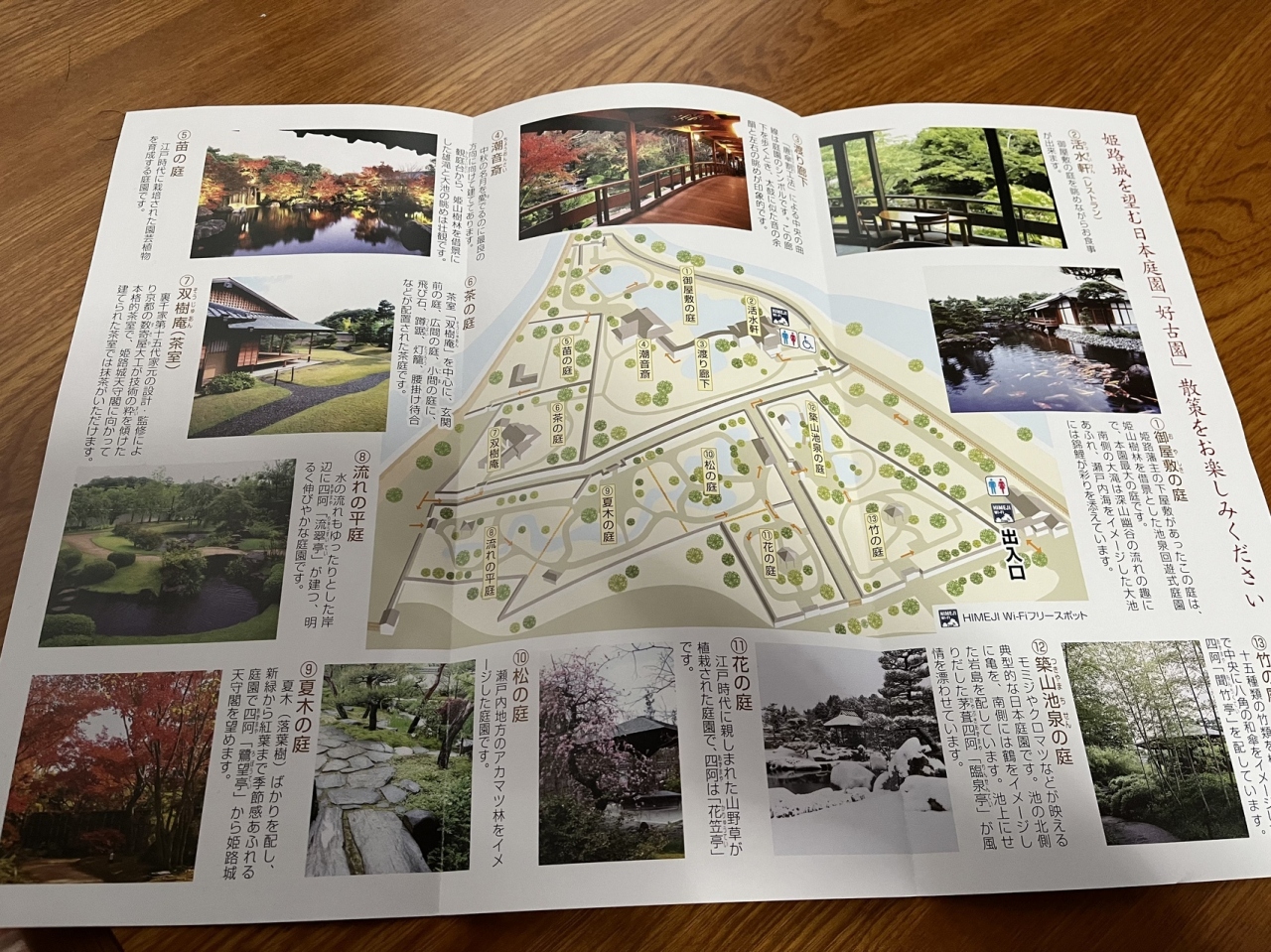 紅葉の季節に姫路城に行ったら、姫路城と共通券で買うと50円しか変わらなくて距離も近いので是非訪れてください。9つの題のついた庭に分かれておりそれぞれ趣きがありますが、天気がよかったので、特に池に映るもみじが素敵でした。中には庭園の見えるレストランもありましたが、待っている方がたくさんいらしゃったので、他で食べた方がいいかもしれません。せっかくグルメの日村さんも来た様で非売品のカレンダーが貼っていました。紅葉の季節は夜のライトアップもあります。