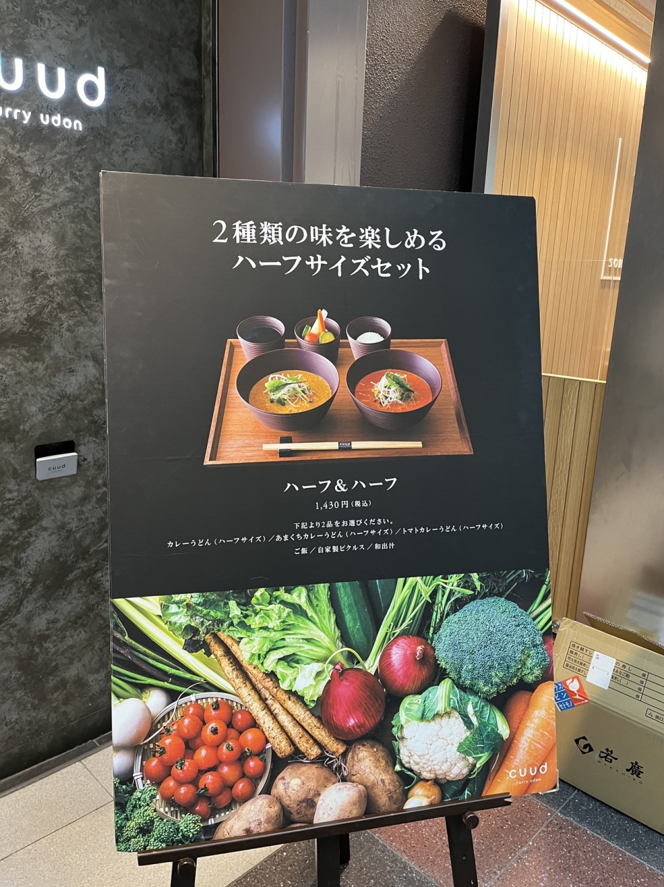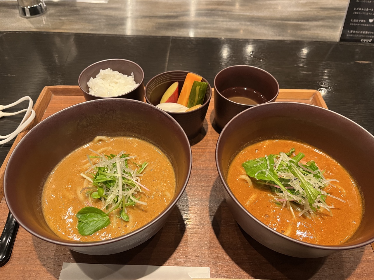 最近はコロナ禍のせいか営業時間にシールが貼られ羽田のレストランの開店が11時の所が多くて10時頃遅めの朝食を食べようと思ったのですが10時でも営業の店も少なく以前から気になっていたお洒落なカレー店のcuudさんに入ってみました。お値段は空港価格で高い(ハーフハーフで1430円)ですが、スパイスの効いた出汁が細めの麺にあって美味しく、付け合わせのピクルスも美味しかったです。お値段の差が少しだったのでハーフハーフにしましたがトマトが好みでした。ご飯を入れたり出汁を入れたりして味変もできます。朝早くは朝カレーもありもう少しお安くなるようなのでその時を狙ってもいいかもしれません。