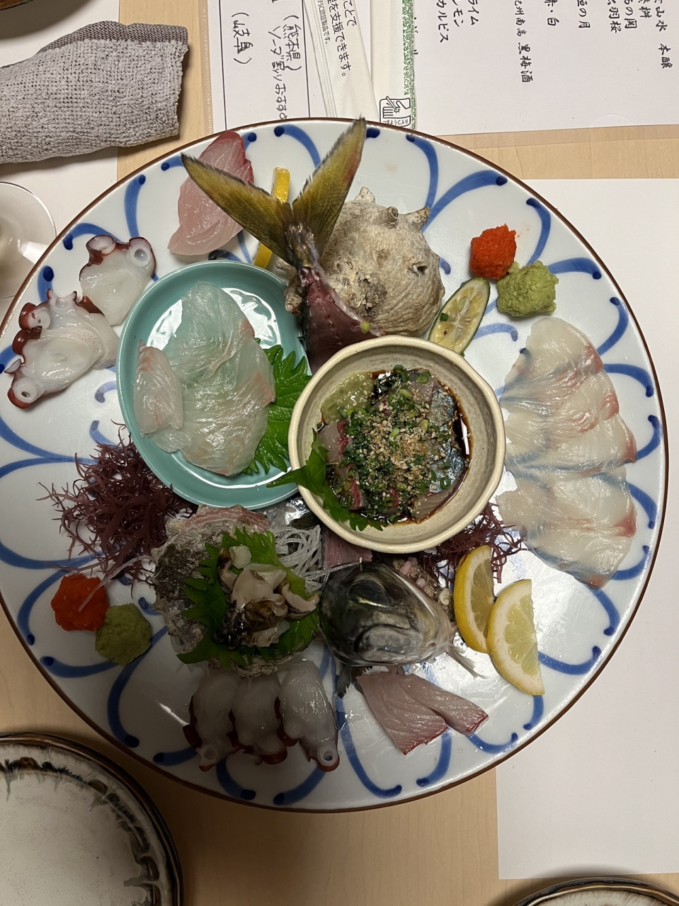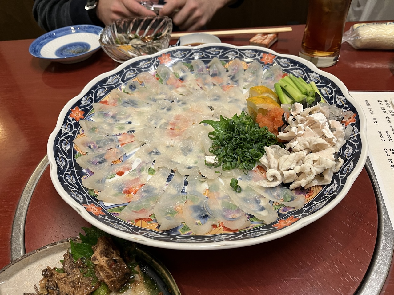 湯平温泉の宿の鷹勝さんに行った事がありとても美味しかったので、博多の鷹勝さんに土曜日に予約をして行っきましたが結構混んでいました。博多の幸コースという飲み放題(7,000円)のコースに当時イカの生き作りとふぐの唐揚げを追加しました。イカの生き作りはとても新鮮で、コースの刺身も美味しく他の物も美味しいです。ただコースで寄せ鍋かモツ鍋を選ぶのですが博多なのでモツ鍋にしたのですが、海鮮メインの店でモツ鍋を選ばない方がよかったかなと思う感じでした。