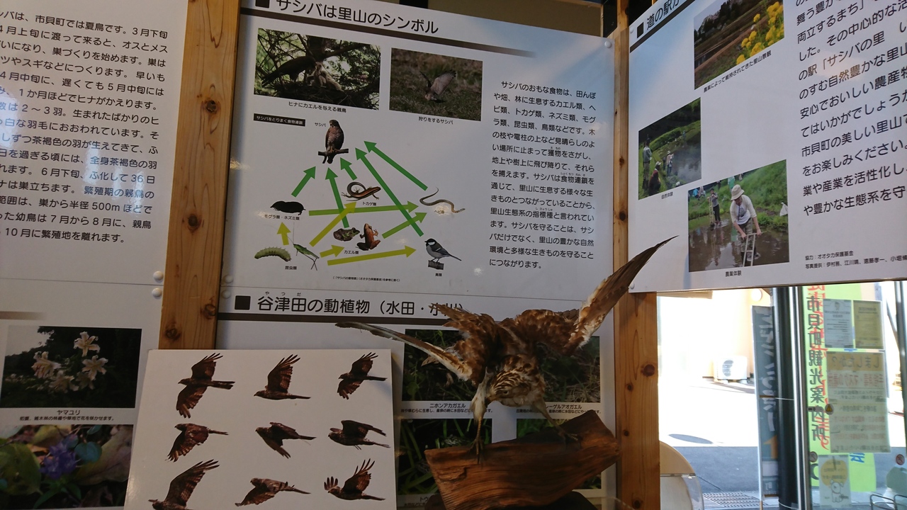 割と新しく2014年にでき綺麗で結構駐車場も広い道の駅です。隣に町役場があり地元の方も多いのかもしれません。農産物もそれなりに豊富で、食べ物も蕎麦、ラーメン、カフェと選ぶこともできました。この近辺は道の駅はが、道の駅もてぎに挟まれ短い距離に3つあり激戦区のようです、道の駅好きでなければどこに寄るかは悩みます。サシバの剥製がパンフレットなどのある情報館にありました。