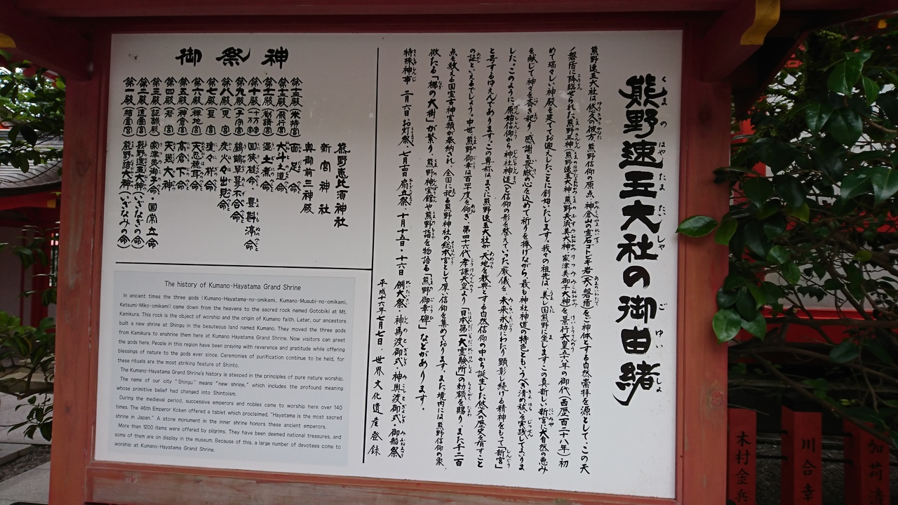 熊野三山の中では一番コンパクトでアクセスの良い場所にある神社で、すぐ側に駐車場もあり駅からも1キロくらいだと思います。イザナギのミコトとイザナミのミコトを主神としてお祀りしてあり縁結びにご利益があるようですが、全部で18柱の神様が祀られていました。御神木のナギの木は葉が裂けないので縁結びに効果があるといわれているようです。今回訪れる事はできませんでしたが神倉神社をもとに麓に祀ったので新宮大社というようです。今度訪れる事があれば神倉神社も訪れたいです。