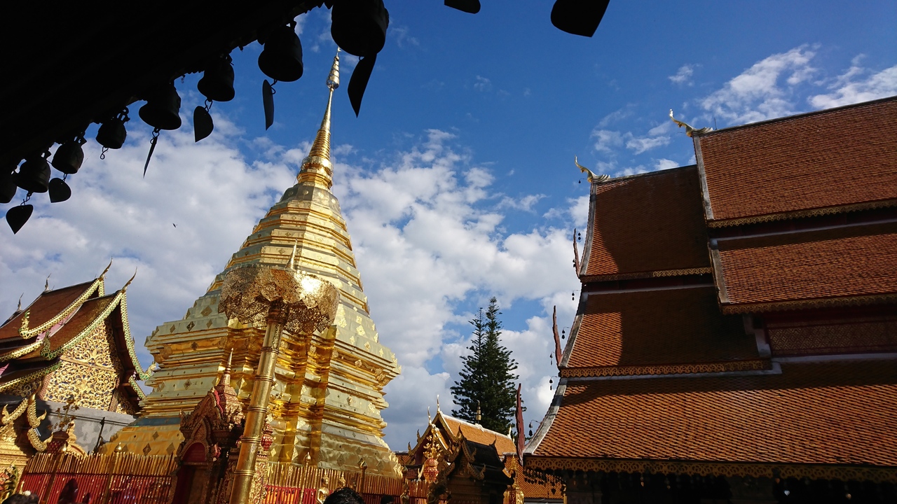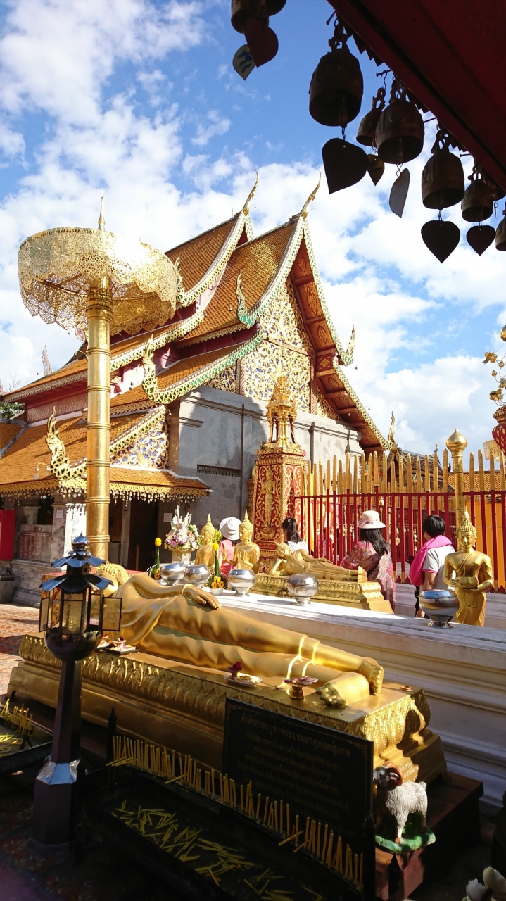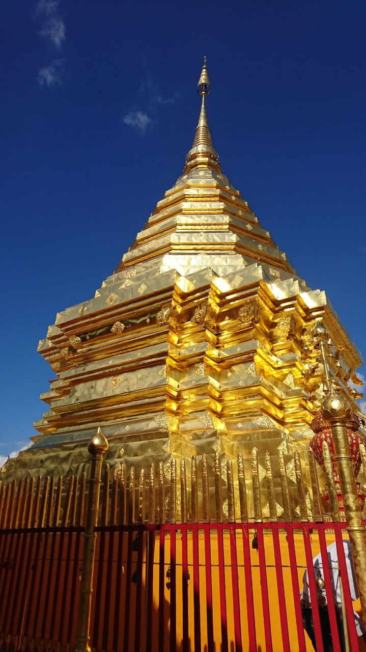 チェンマイ郊外の黄金に輝く寺院です。市内からチェンマイ動物園まで行きそこから山の方に行くソンテウに乗り換えても行けるようですが、私達は郊外はオプショナルツアーに申し込んで行きました。天気も良かったので仏塔が黄金に輝いてとても綺麗でした。連れが前日旧市街で道の草むらで足を少し痛めていたのでケーブルカーで登り降り出来たので便利でした。