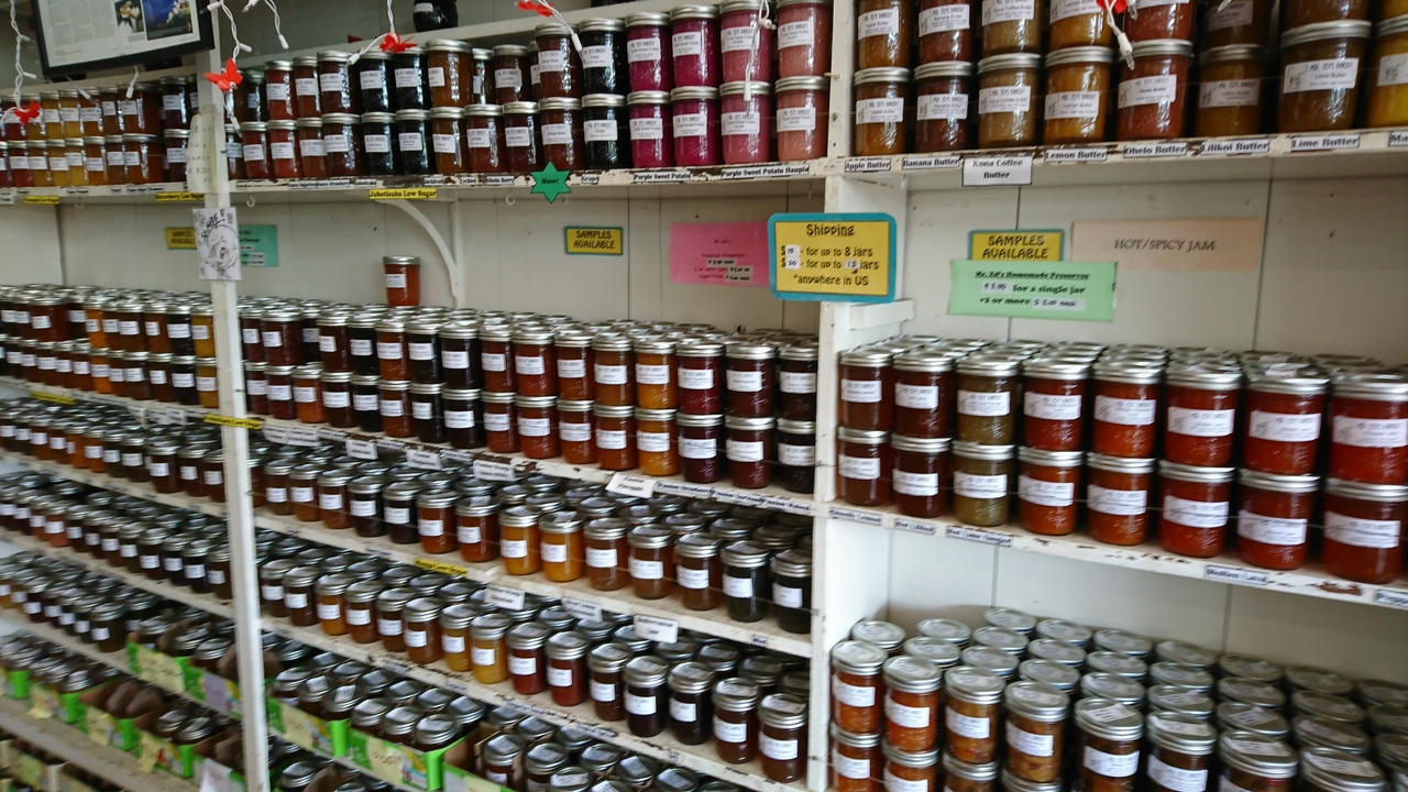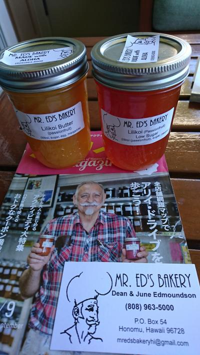 今回はアカカ滝に行ったので、テレビでも見た事のあるエドさんのジャムの店を楽しみにしていました。百数十種類もありますが、有名なリリコイでも色々あるので迷っているとエドさん本人が試食しますかと言ってくれて、人気のある幾つかは試食用があり出してくれました。