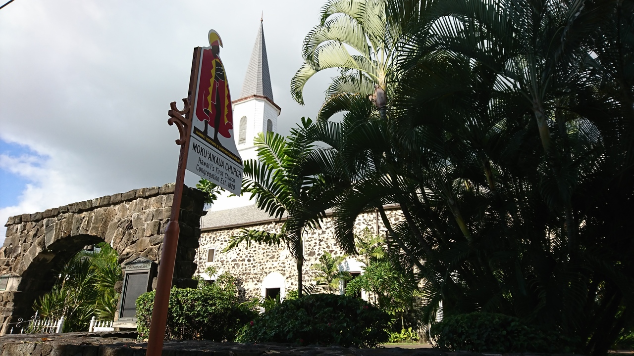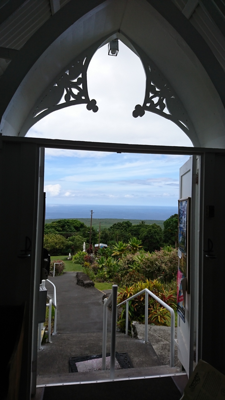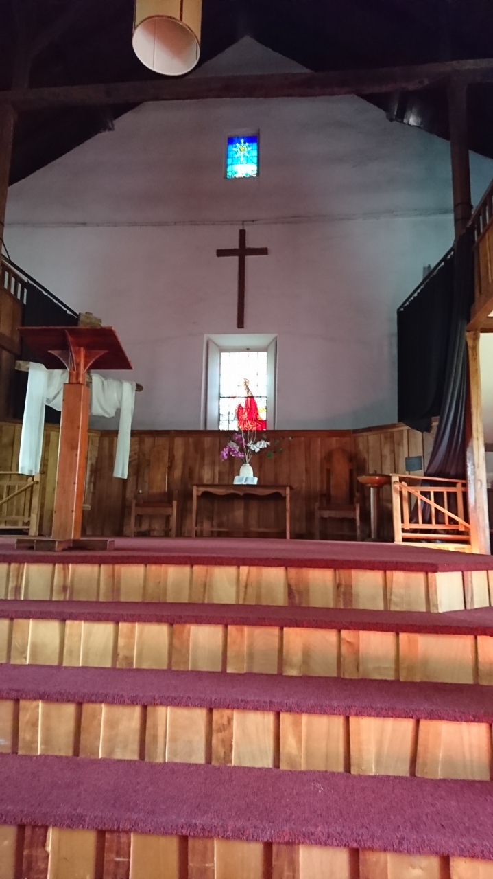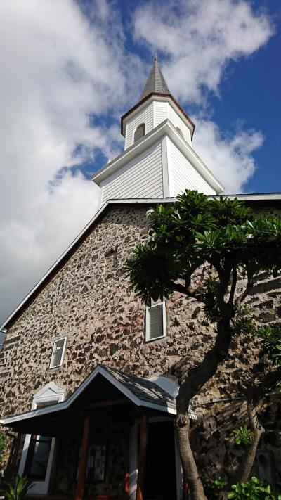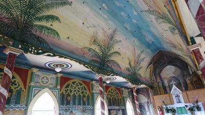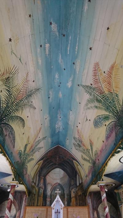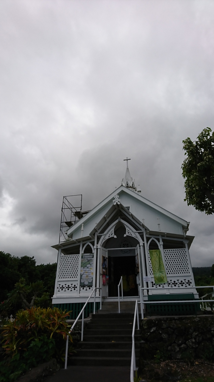 カーナビを入れると狭い道を案内されてこんなところにあるのかなという目立たない教会ですが、中は木造で椰子の木の絵が描かれていたりして、とても南国風の雰囲気があり素敵な教会です。庭も綺麗に手入れされていて色々な花が咲いていました。