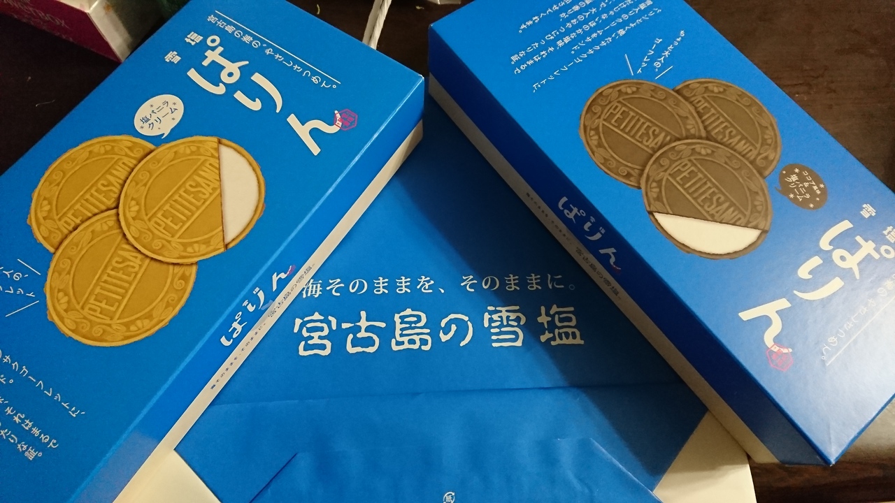 宮古島のお土産に雪塩のお菓子はおススメです。去年はバームクーヘンや、ふわふわなどが目立ってましたが今年はまた色々な種類がいっぱい置いていました。ぱりんというゴーフレットを買ってみましたが美味しかったです。
