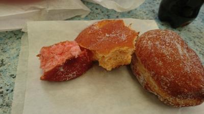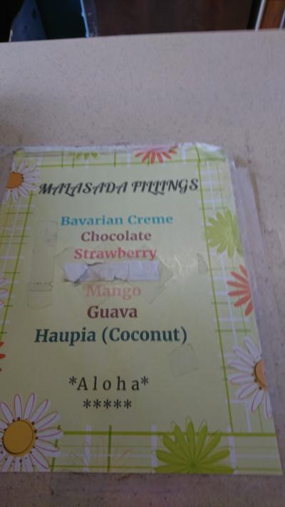 午後のおやつタイムに行ったら、週末だったので現地の方で結構行列でした。何にしていいか迷って、色々な味を大人買いしてしまいました。見せていただいたメニューにプレーンがなかったのでクリーム入りを全部買ってしまいました。大きめのマラサダでクリームは端っこまで入っているわけではないのでプレーンの味もクリーム入りでも楽しめます。揚げたてはもちろん美味しかったですが、コンドだったので翌日レンジで温めても美味しかったです。