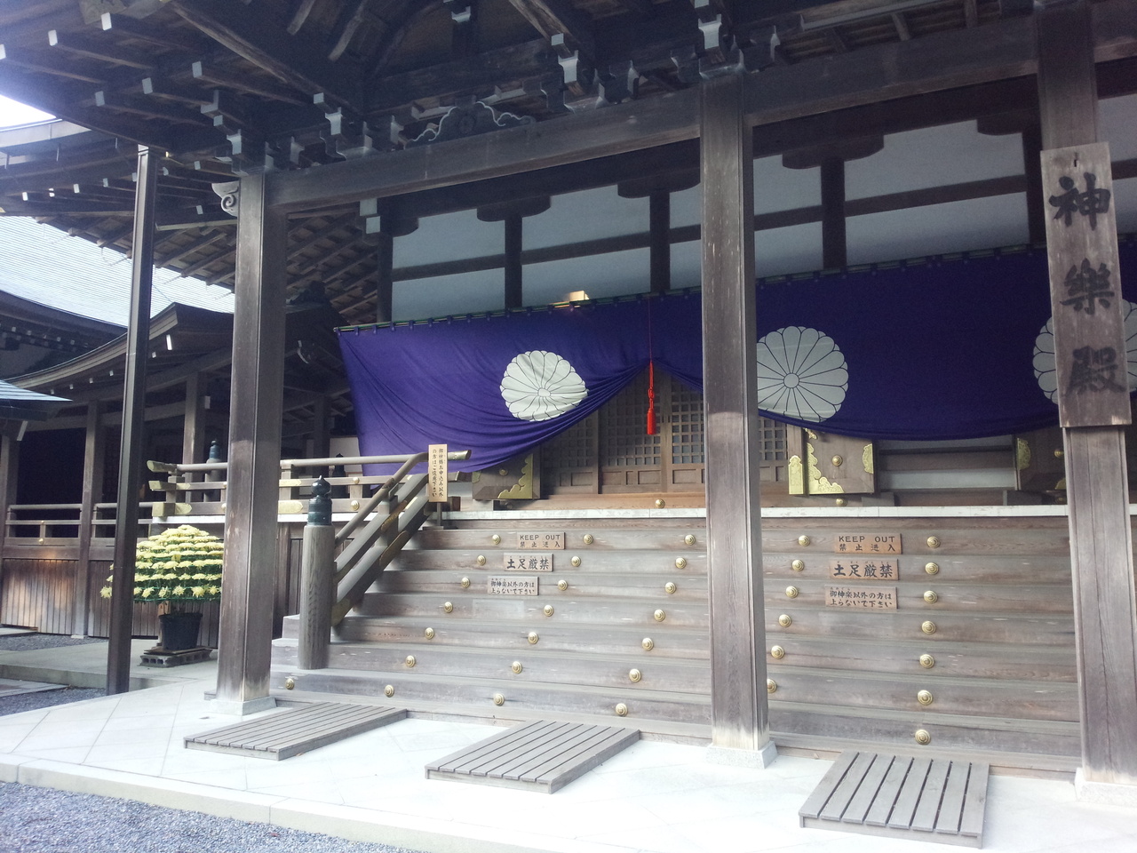 伊勢神宮内宮の神楽殿ですが、ここに神様がいらっしゃっててお参りをするというよりはここでお守りやご祈祷や御朱印を申し込んだりする場所です。でもとても立派な建物でやはり伊勢神宮に来たら手にしたいお守りも色々な種類がありました。お参りの最後によってください。紅葉の季節は菊も綺麗でした。