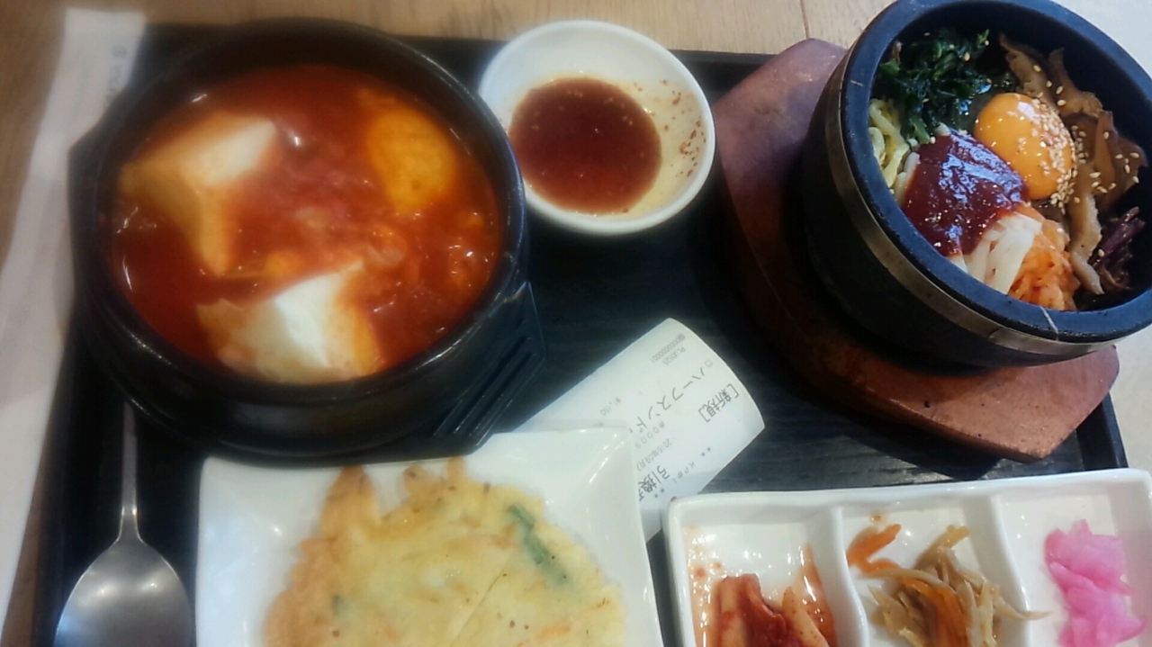 ハーフ石焼ビビンバとスンドゥブのセット(税別1,150円)を頼みましたが、並んでいる人は数人でよそとそんなに変わらなく、このお店で頼んだ後一風堂に行きそこでも数分並び豚骨ラーメンを頼みそのラーメンができて取りに行き食べ終わった後、数分してやっとブサーが鳴りやっと出来上がりました。味は美味しかったですがメニューと混み具合に寄ってはだいぶ待つかもしれません。