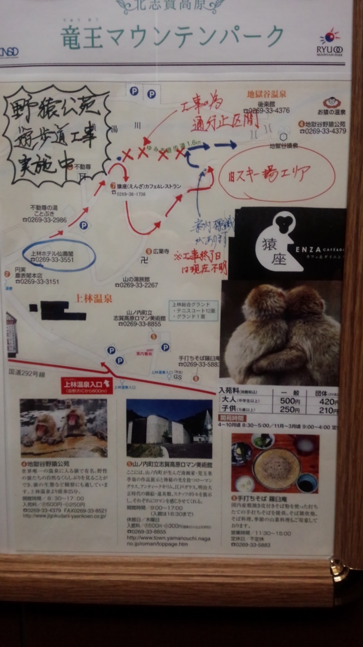 地獄谷野猿公苑に近い上林温泉に泊まって楽しみにしていたのですが、ホテルの案内で雪の季節に向けて遊歩道が工事中で遠回りしなければいけないそうでした。その日も前日も雨が降っていたし、秋は出てこない日もけっこうあるとホテルの方がおっしゃっていたので挫折してしまいました。