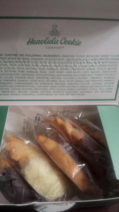 ビックアイランドクッキーさんも美味しくて自宅用としては大好きなのですが、パイナップルの形が可愛いいのでお土産はハワイっぽいこちらのクッキーに決めているのですが、今回は初めてアラモアナショッピングセンターのフードコートの中にあるホノルルクッキーカンパニーさんで購入しました。幾つかの店で使えるポイントカードはこちらでは使えないようですが、代わりにおまけのクッキー5個入りの小箱をサービスでくれました。