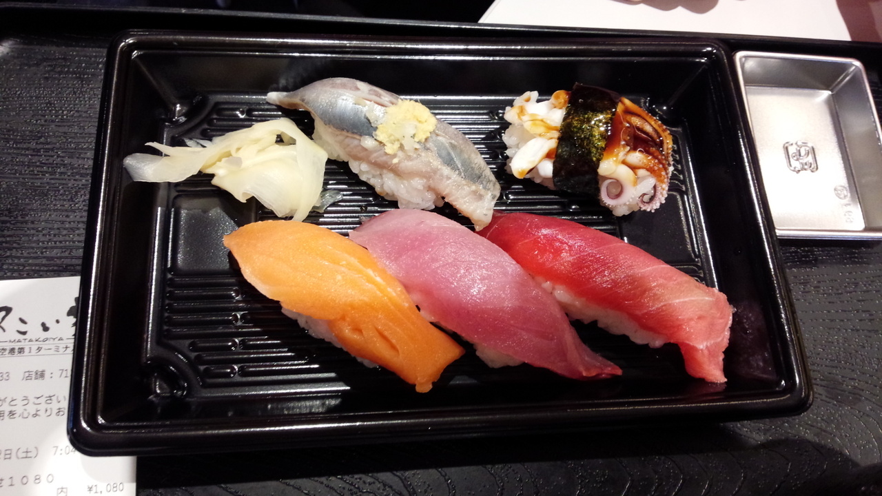 北ウイングと南ウイングの間の中央の場所にあるので飛行機の行き先はどこでも行きやすい場所にあります。制限区域内なので、時間を気にせず食事が出来ます。築地にあるお店の支店のようでちゃんとしたお寿司です。近くのテーブルに持っていく事は出来ますが飛行機に持っていく事は出来ません。目的地に着いてから一杯食べたいので朝は少しだけ美味しいものを食べたい時にはいいかもしれません。そばに蕎麦屋さんもあるので家族で、違うものを食べることも出来ます。