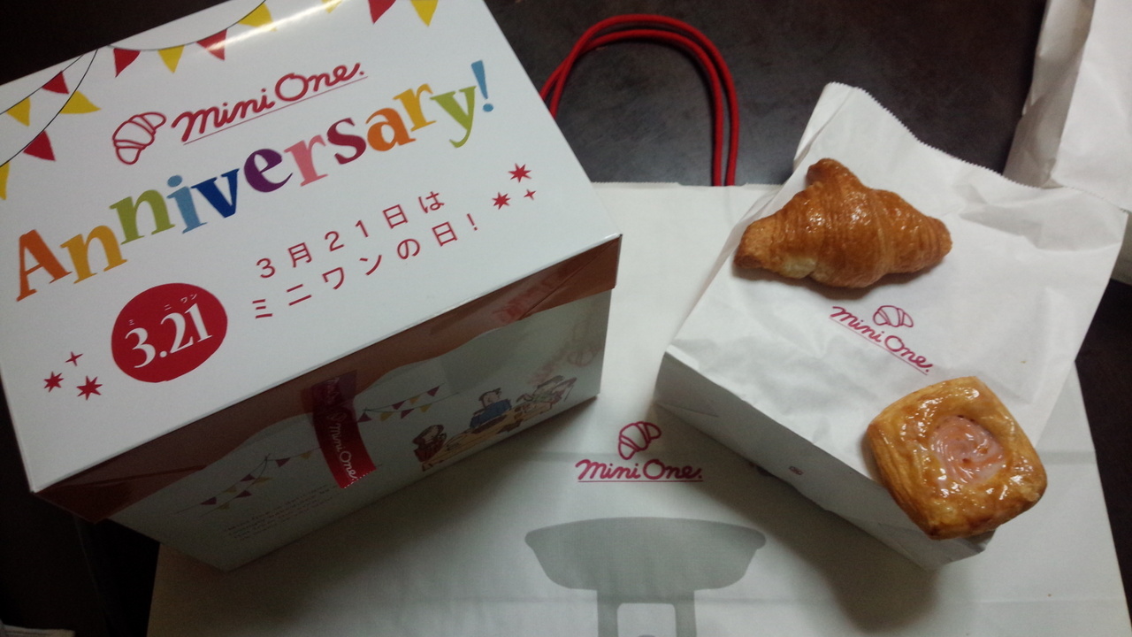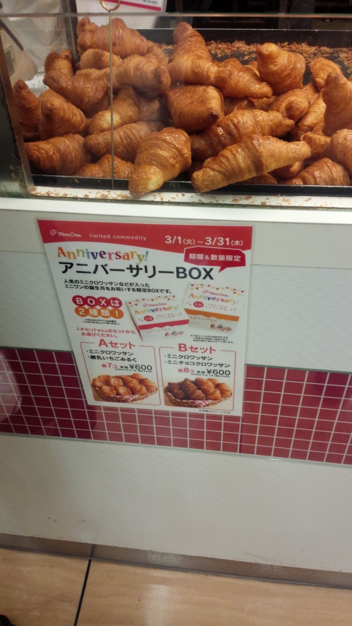 ミニワンでないパンも美味しいのですが、やはり人気はミニクロワッサンです。3月限定のアニバーサリーボックスを買ってみて練乳イチゴミルクを食べてみました。