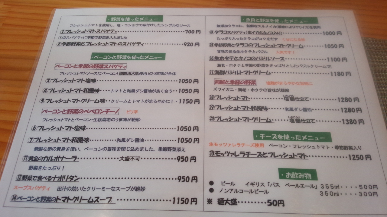 家族経営で昼しかやっていないパスタ屋さんですが、生麺で太めでもちもちとした麺です。具の野菜は地場産の野菜を使ってとても美味しいです。昼も遅めに行くと早じまいをしていたり選べる種類がなかったりしてなかなか行けないのが難点です。店は居酒屋が3件並んだ真ん中にあり、ちょっとわかりづらいです。