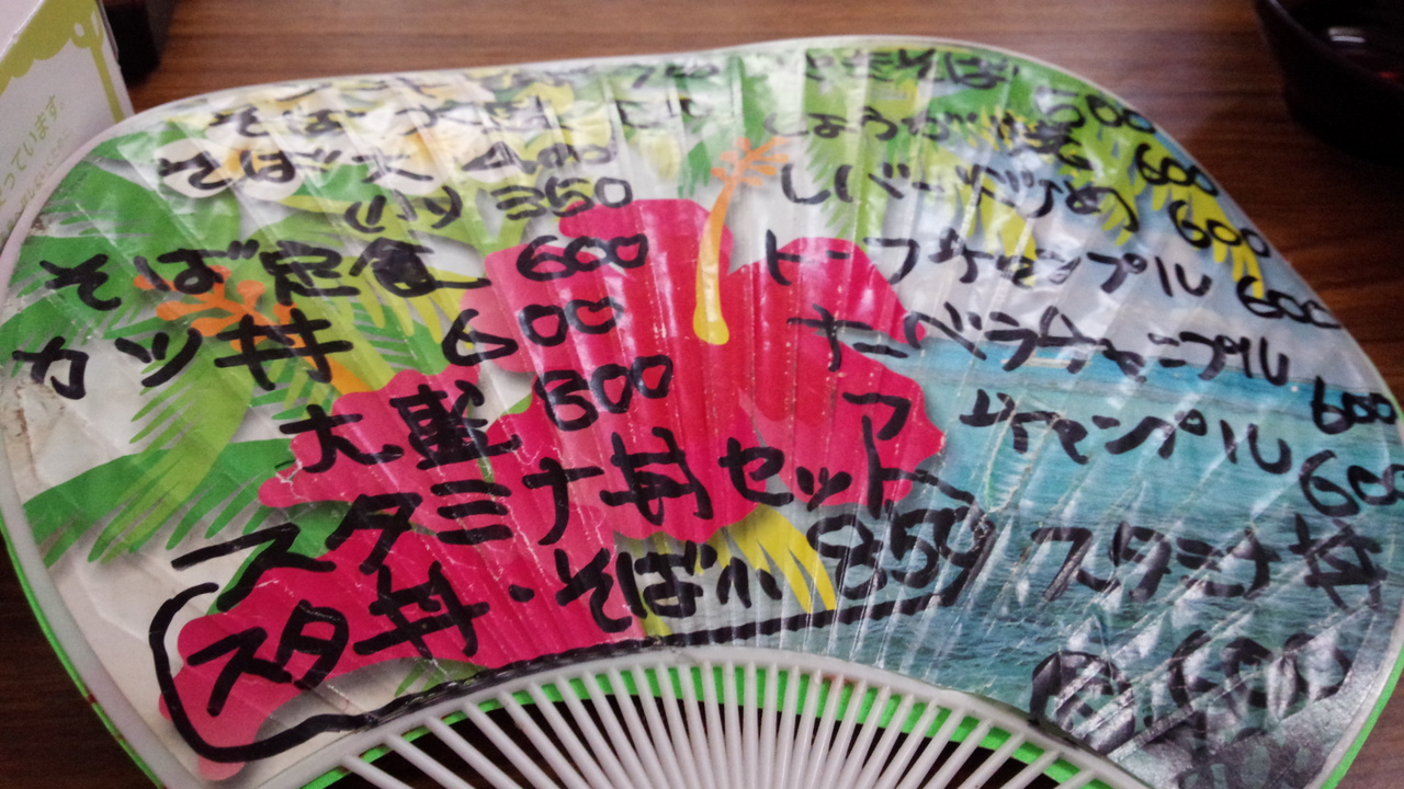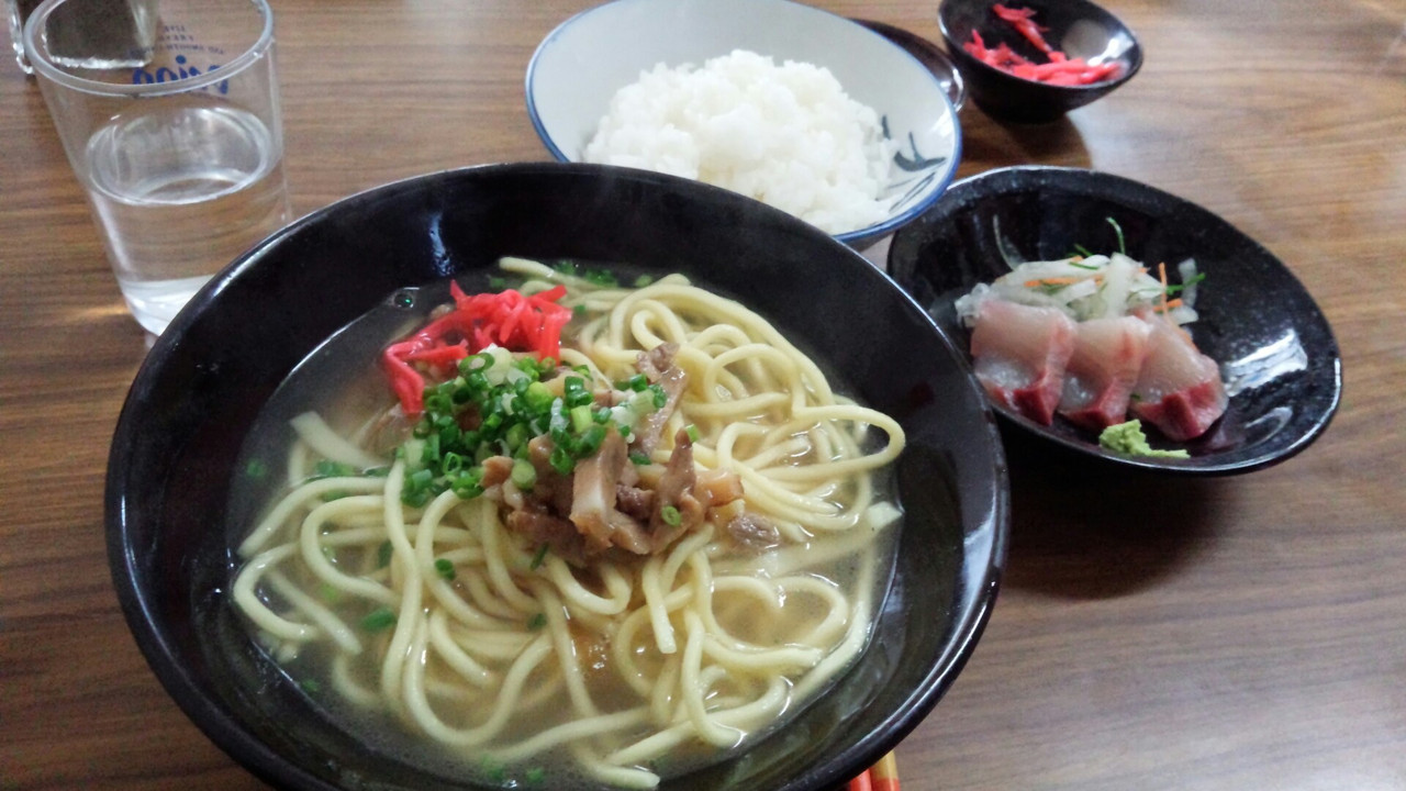 スタ丼セット(850円)とそば定食(650円)を頼んでみました。八重山そばはとてもさっぱりした味付けでテーブルにコーレーグースがありませんでした。濃いめのスタ丼にはさっぱりしたそばが合う感じでしたが単品だったらもう少し濃いめの方が好きかな。そば定食には刺身3切れとご飯付きです。スタミナ丼セットは結構食べごたえがあります。店はご飯どきでないのに地元の人が結構いました。なぜか北斗の拳のパネルがあります。- 旅行時期