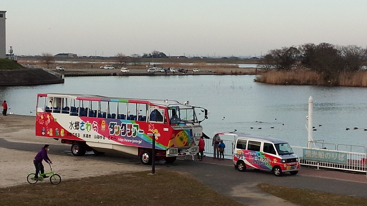 正月に香取神宮に行った時に道の駅水郷さわらに寄りましたが、道の駅のすぐそばの利根川には水陸両用車の乗り場になっていました。他に昔風のさっぱ船のツアーなどもある様でした。道の駅は2つの棟に別れていました。物産館には結構色々な農産物や簡単な食事が出来るところもありましたが、やはり佐原らしいのは川魚の加工品なども売っていました。