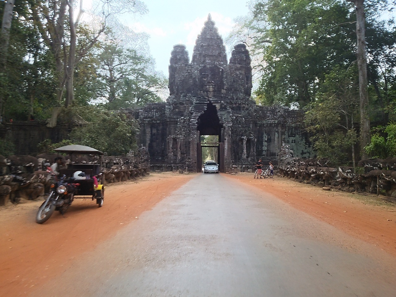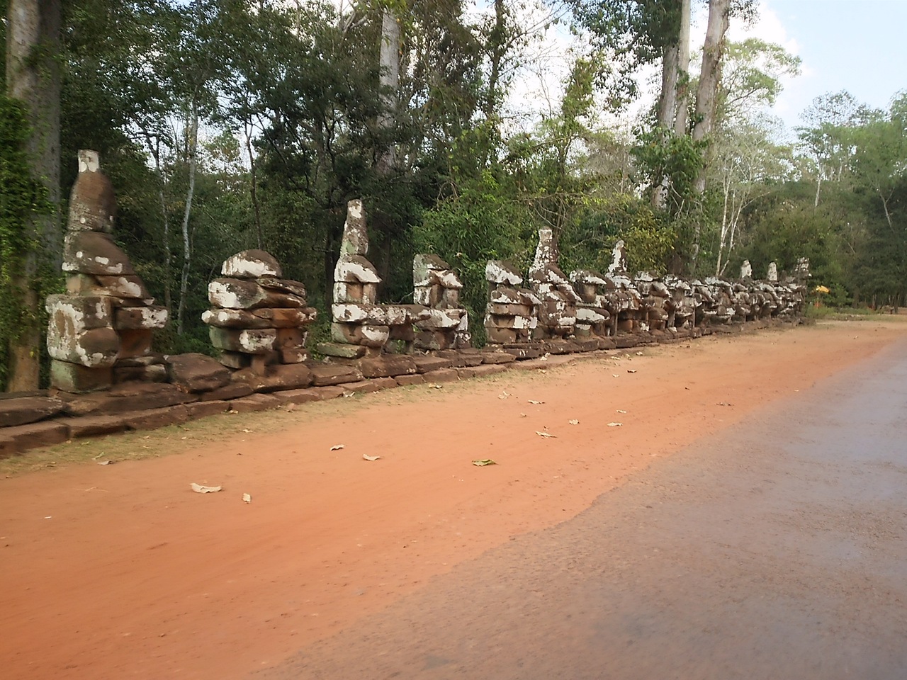アンコールワットからアンコールトムのバイヨンへ行く場合、ほぼ通るのがこの門です。なんか、小さな山にくりぬかれたトンネルみたいです。油断しているとトゥクトゥクであっという間に通り過ぎてしまうので、気を付けて。門の手前にも像が立ち並びますよ。