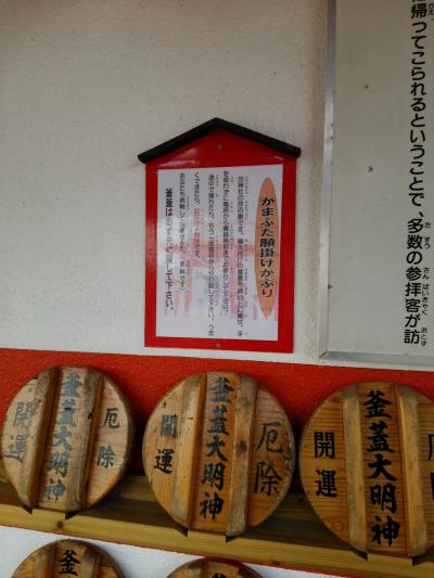 ここで有名なのが、釜の蓋を頭にのせて鳥居から賽銭箱まで歩く願掛け。やってみたら難しく、なかなかたどり着けません!面白いですけれどね!